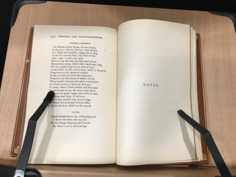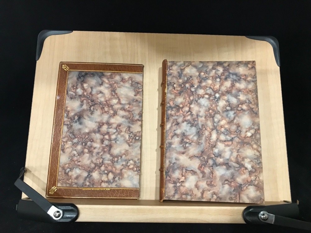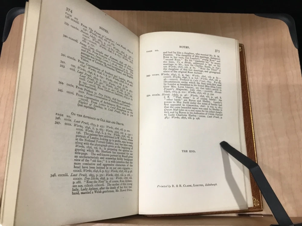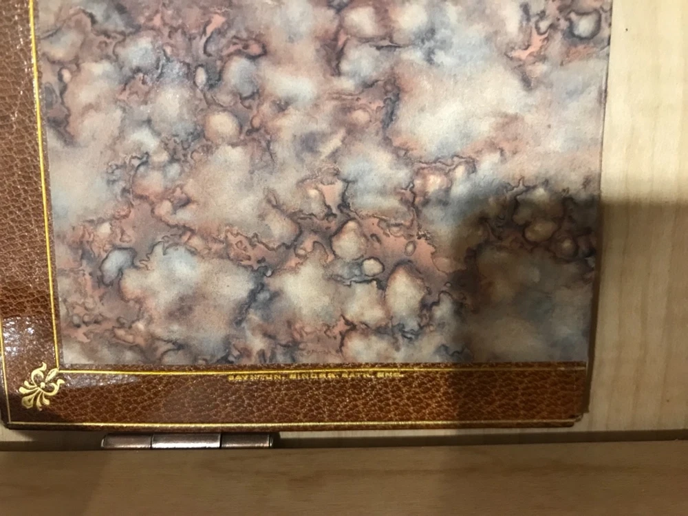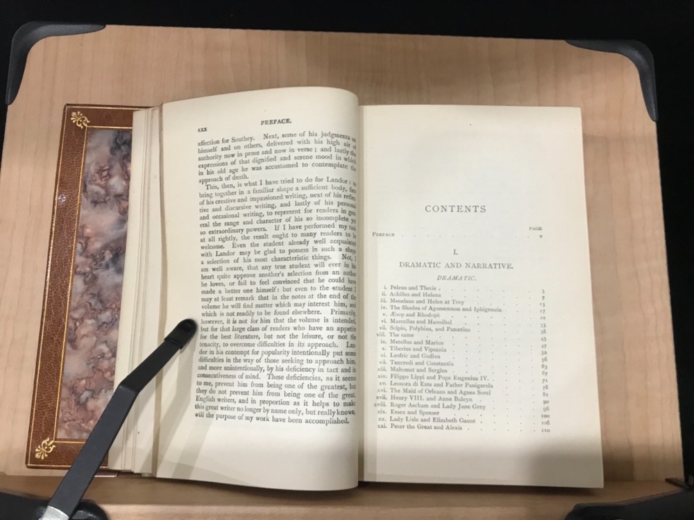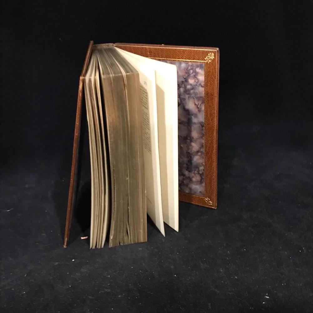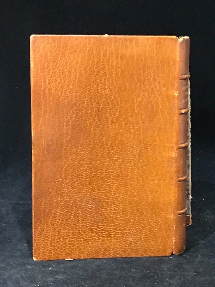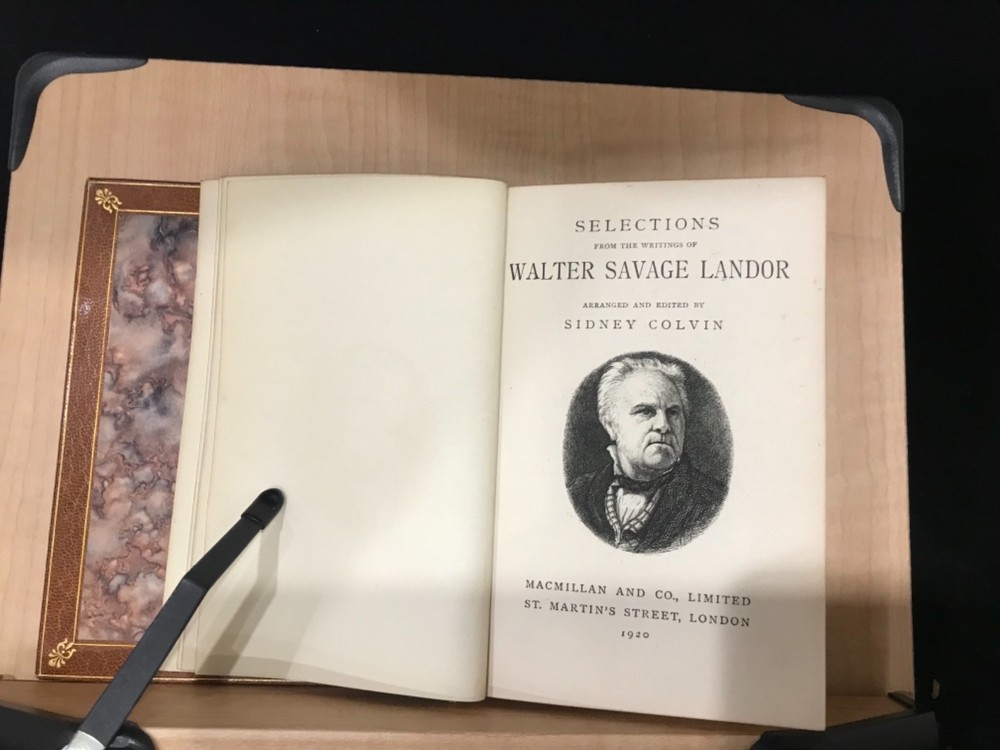 Walter Landor was a writer and poet of the late 1700s, early 1800s whose work was varied. His poetry was highly praised but was not as popular as might be expected while his writings covered everything from politics to criticisms of theater and art. He had an exciting and excitable personality which translated well into his writing. This pretty little book of selections includes a preface by Sidney Colvin, along with poems covering the topics of death and mortality, love, marriage, and family. Nicely bound by Bayntun Binders of Bath, England. A part of the Golden Treasury Series by Macmillan. Good Condition: 12mo, leather with front board off, pretty turn under with florets in each corner and binder mark on bottom of front, ridged spine with title in second band and date at bottom in gilt. Marble Endpapers. Portrait on title page of Landor. Pencil marks on sparepage at front. “Selections from the Writings of Walter Savage Landor”. Sidney Colvin, editor. London: Macmillan and Co. Limited. 1920. FORN-Shelf-563-RAREB1920ABCA