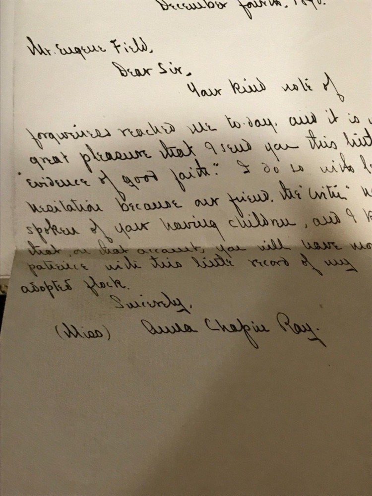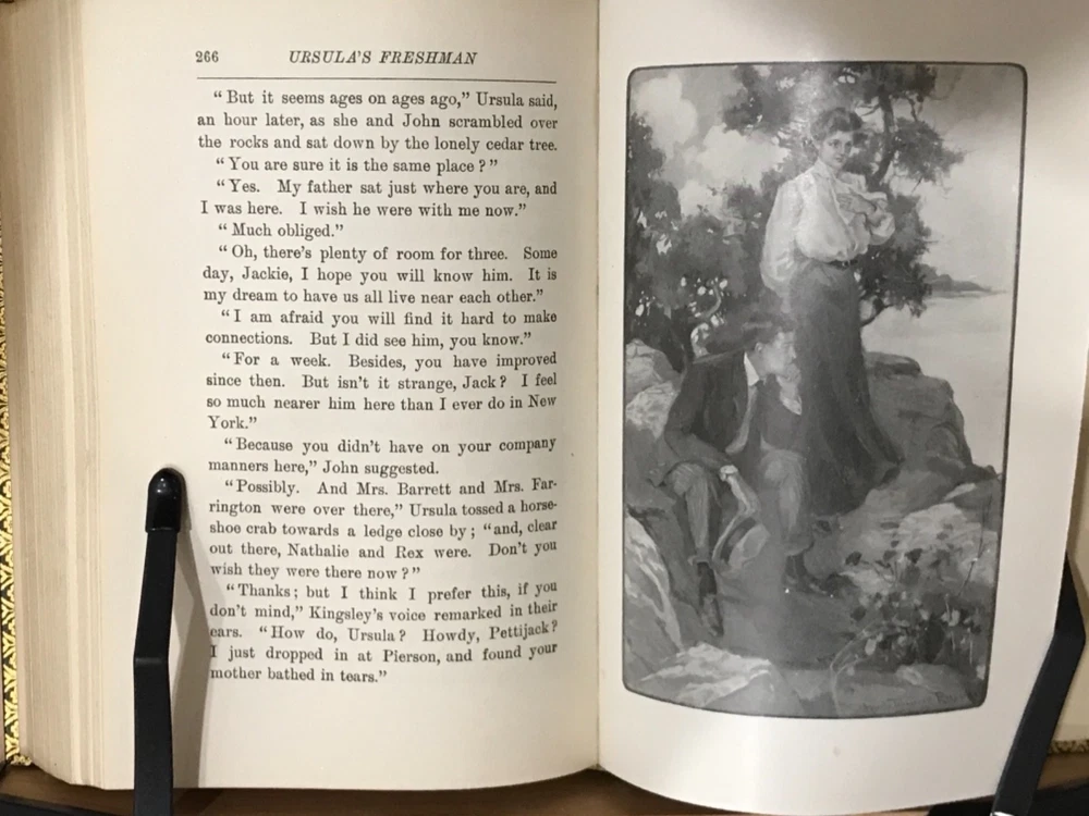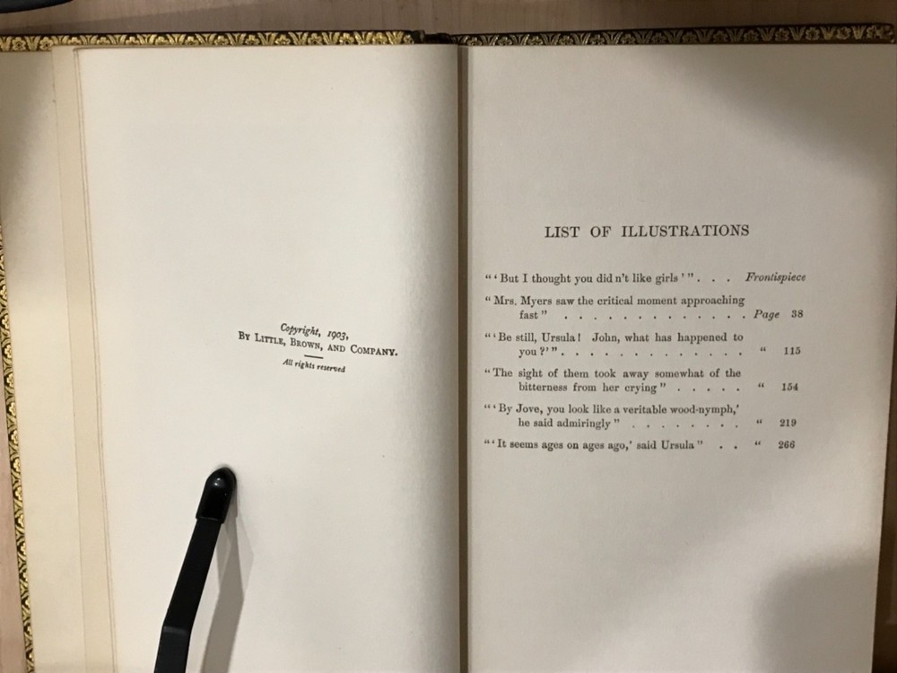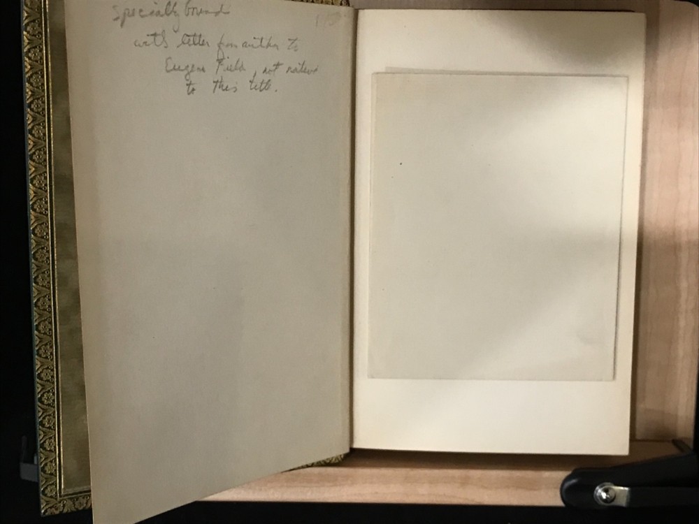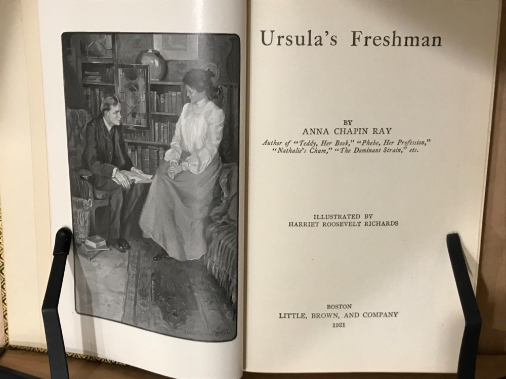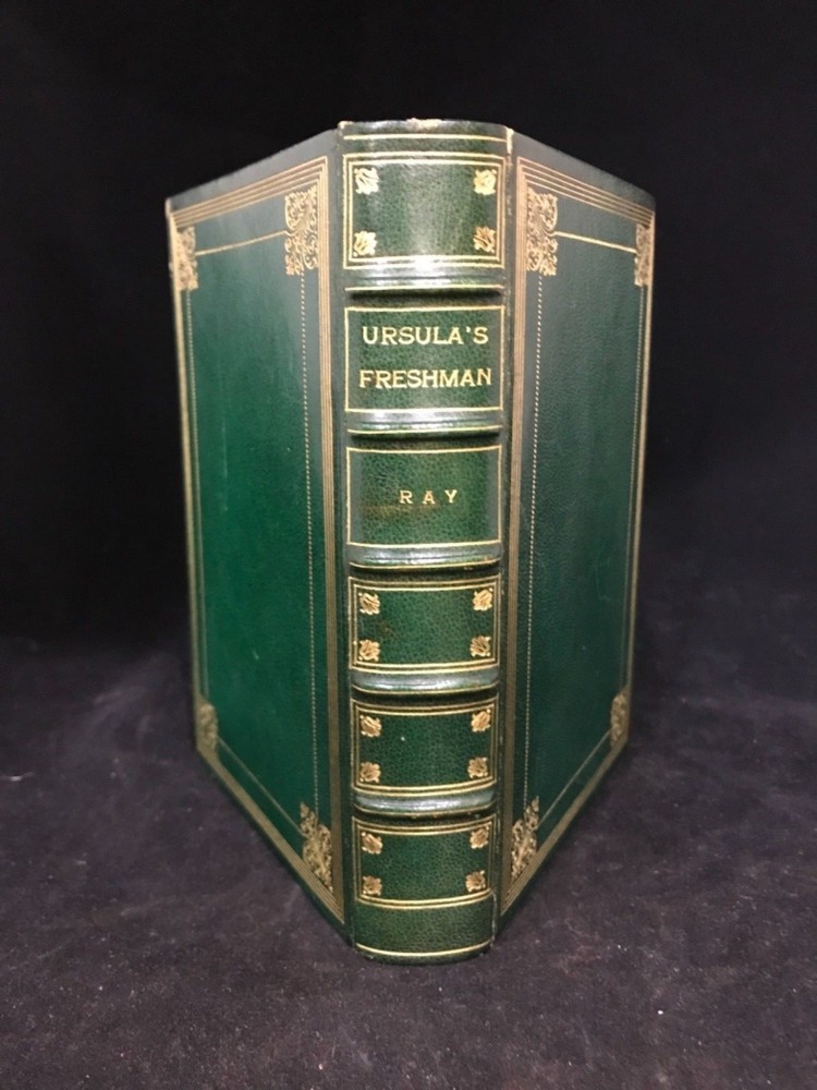 A beautifully bound piece of Victoriana, this novel by Anna Chapin Ray is a classic story of a young woman and her attempts to make a place for herself in the world as the poor relation sent off to the big city to garner a little education and a lot of husband, with any luck at all. This particular edition, a 1921 reprint, is beautifully bound in green leather with elaborate gilt decorations on the front and back with a ridged and banded spine and matching marbled endpapers. The turndown is a lovely gilt floral design. Bound into the front spare is a letter from the author to Eugene Field, commenting on his children and his generosity in forgiving her? Ray sends this book to Field for his children and as a token of her regard for his work. The illustrations are intact and the work of Harriet Roosevelt Richards, a frequent collaborator with Ray whose illustrations are well-known and, in this text at least, charming in their detail and subject. Very Good Condition: 8vo, green leather with gilt decorations, raised and banded spine with gilt decorations in the corners of each band that echo the gilt designs on the cover. Olive green sueded paper marble endpapers. Pencil marks noting bound in “non-native” letter (see photo). Six Illustrations by Harriet Roosevelt Richards intact. “Ursula’s Freshman”. Anna Chapin Ray. Boston: Little, Brown & Co. 1921. Special bound edition. RAREA1921BIJA
