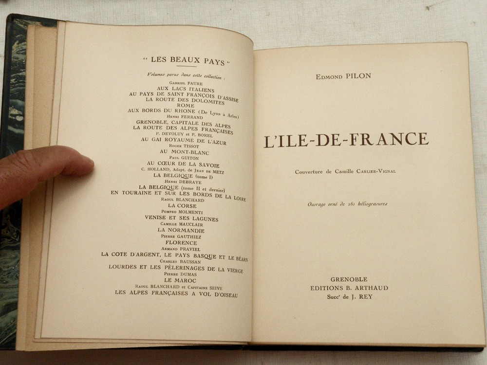 Published in France, copyright B. Arthaud, 1929, Editions J. Rey. BEAUTIFULLY LEATHER BOUND by publisher, I'm presuming, given that it includes the paste-on that is seen on paperback editions. It has gilt letters on the spine, 5 bands, top page edge gilt. Small bit of spine loss top of spine, light wear where the boards meet the spine, very light wear to board edges, very solidly bound, marble endpapers, no marks, 216 pages followed by the Table of Contents and the Colophon page. 261 STUNNING SEPIA "HELIOGRAVURES" THROUGHOUT; photographs and illustrations. Cover illustration by Camille Carlier-Vignal. The Editions J. Rey (Jean Rey) of B. Arthaud were a series of beautifully illustrated books on regions and countries published prior to 1930. Further series were produced by B. Arthaud after the "Editions J. Rey" came. This book is from a series titled, "Les Beaux Pays" or "The Beautiful Countries". A publication description behind the title page indicates that this is the 23rd book in that series. B87