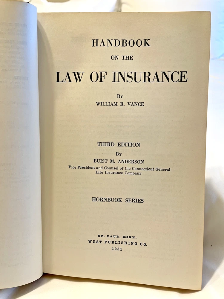 1951 HANDBOOK ON THE LAW OF INSURANCE Written by William R. Vance Third Edition by Buist M. Anderson A comprehensive guide to the legal principles and practices of the insurance industry. The author covers a wide range of topics, from policy drafting and interpretation to claims handling and litigation, making this a valuable resource for insurance professionals, attorneys, and students of the law. This work has been selected by scholars as being culturally important, and is part of the knowledge base of civilization as we know it.