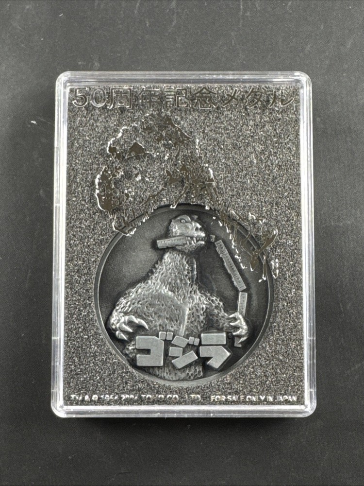 1954 GODZILLA TRAIN BITER Metal Coin Medallion In Case FINAL WARS Japan Import This is the 50th anniversary commemorative medallion with 1954 godzilla on the front and 2004 Godzilla final wars on the back .