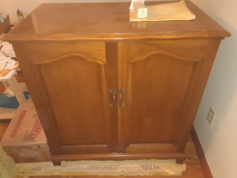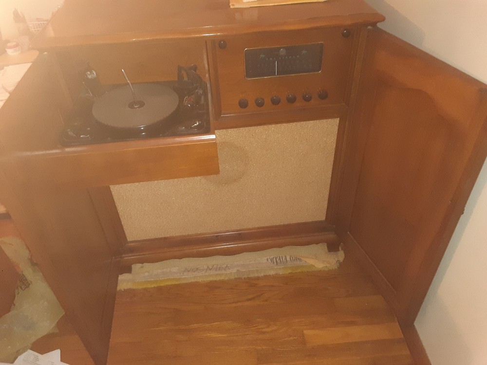 1957 Fisher Console Radio And turntable in a cherry cabinet in excellent condition. comes with owners manual and adapter for 45's. buyer will have to move it....