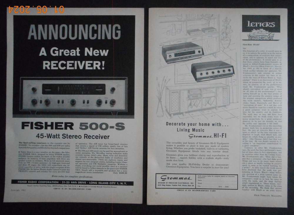 FROM A SMOKE FREE HOME. ORIGINAL(100% GUARANTEED) ORIGINAL VINTAGE AD, page pulled by me. 2 Pages both doubls ided , 3 Fisher ads 1 GRommes ad. Fisher of Long Island City NY and Grommes of Franklin Park, IL. FULL page m easures approx 8" x 11". No creases or wear unless mentioned above. WOULD LOOK AWESOME FRAMED. PICTURE IS OF ACTUAL ITEM UP FOR AUCTION AS IS THE RULE WITH ALL MY AUCTIONS. Shipped in a firm tube and SECURELY PACKED FOR A SAFE ARRIVAL. FAST EMAILS/ FAST SHIPPING = GREAT SERVICE. I have been selling on ebay since 1997 so bid with confidence. ENJOY LIFE, IT'S SHORT, Perry. Combined Shipping, please read before paying ; Place all items in ebay cart and request a new invoice before paying. It should update automatically or I can change it. 1 ad or 100 ads same price for shipping.