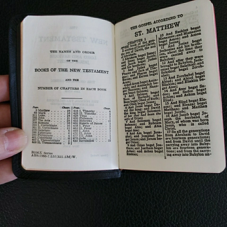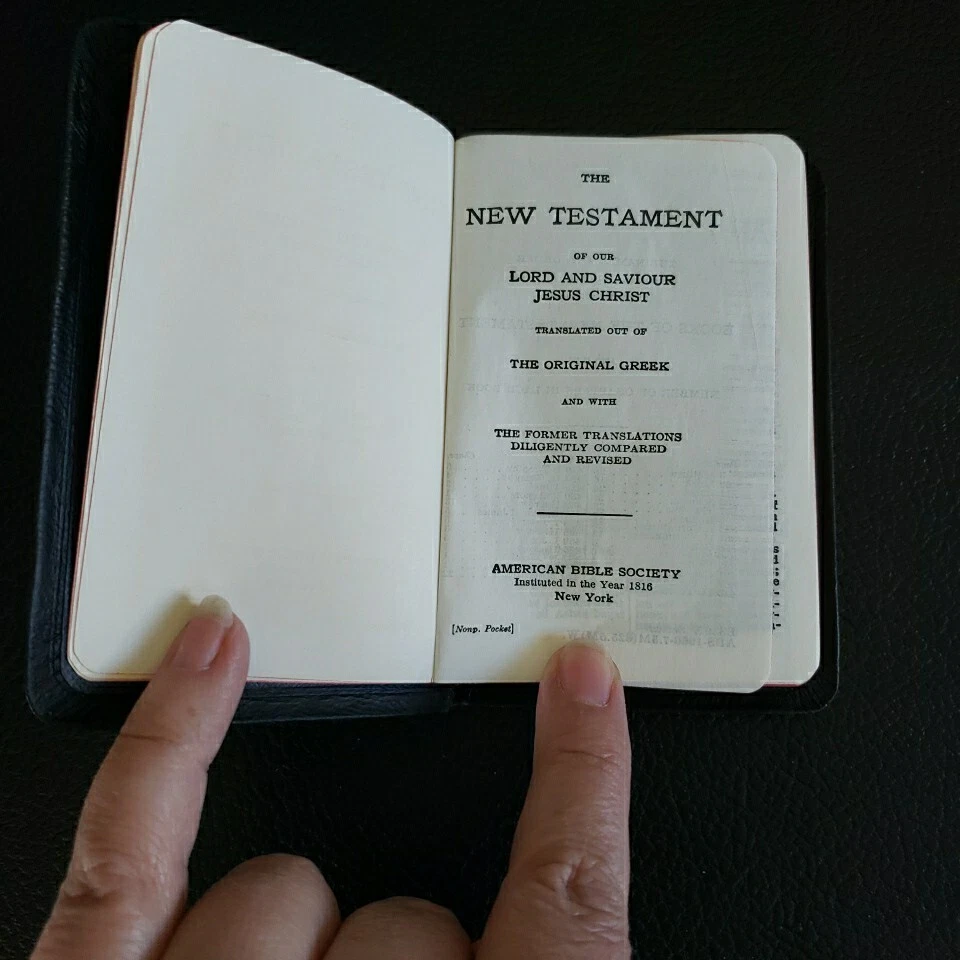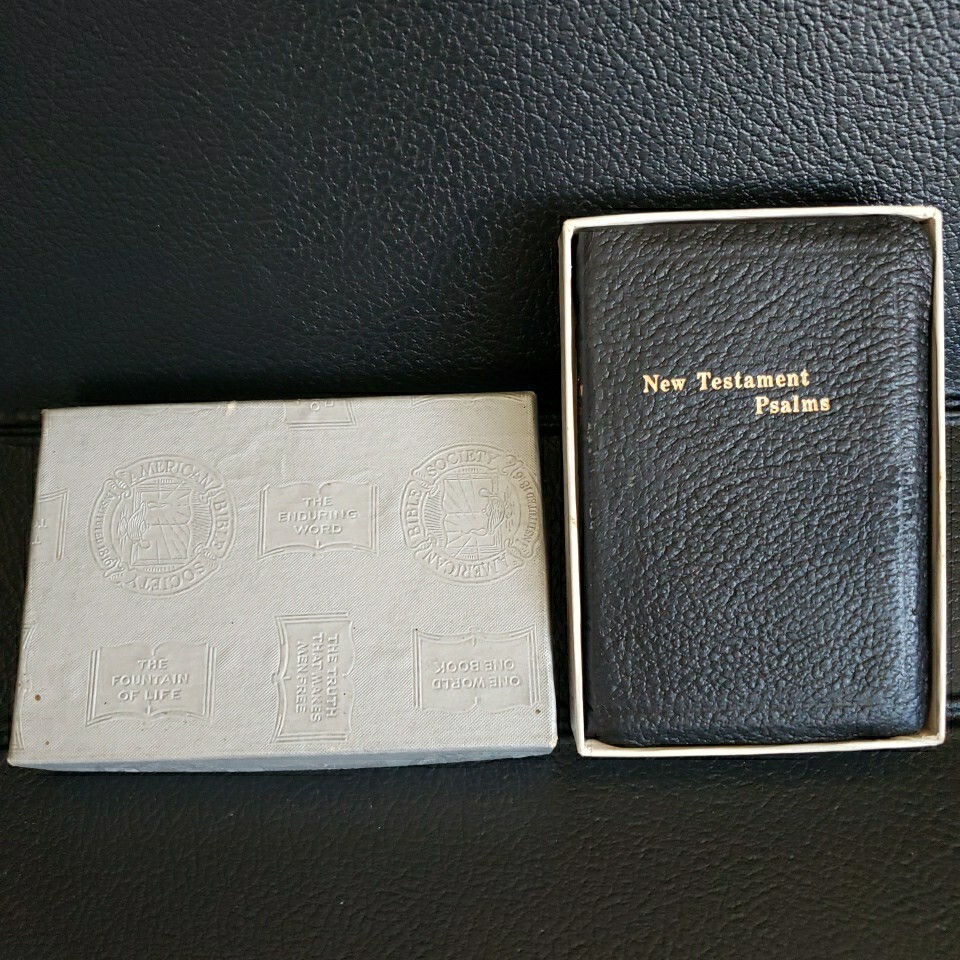 1963 American Bible Society B336X series New Testament with Psalms pocket bible. Has gift inscription on inside front free end paper. Comes in original box. See photos....