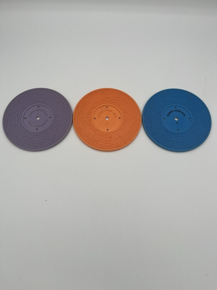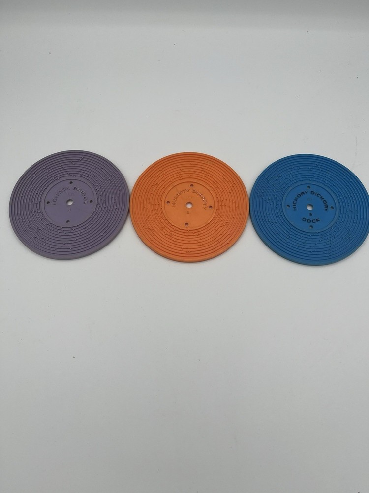 These discs are for a vintage 1971 Fisher Price record player. There are 3 records, each with a song on the front and back, so 6 songs total. The songs are: London Bridge Hickory Dickory Dock Humpty Dumpty Oh where has my little dog gone? Jack and Jill Edelweiss