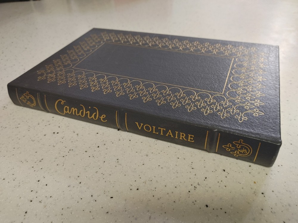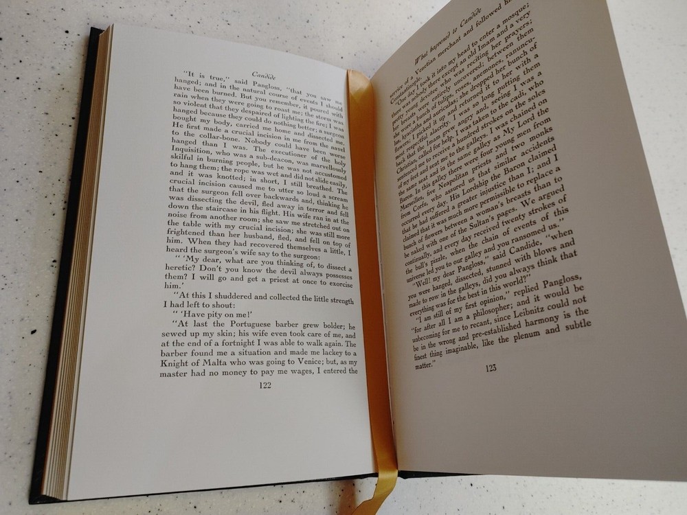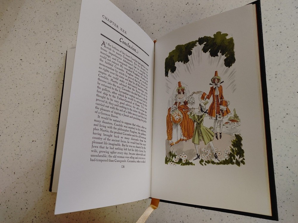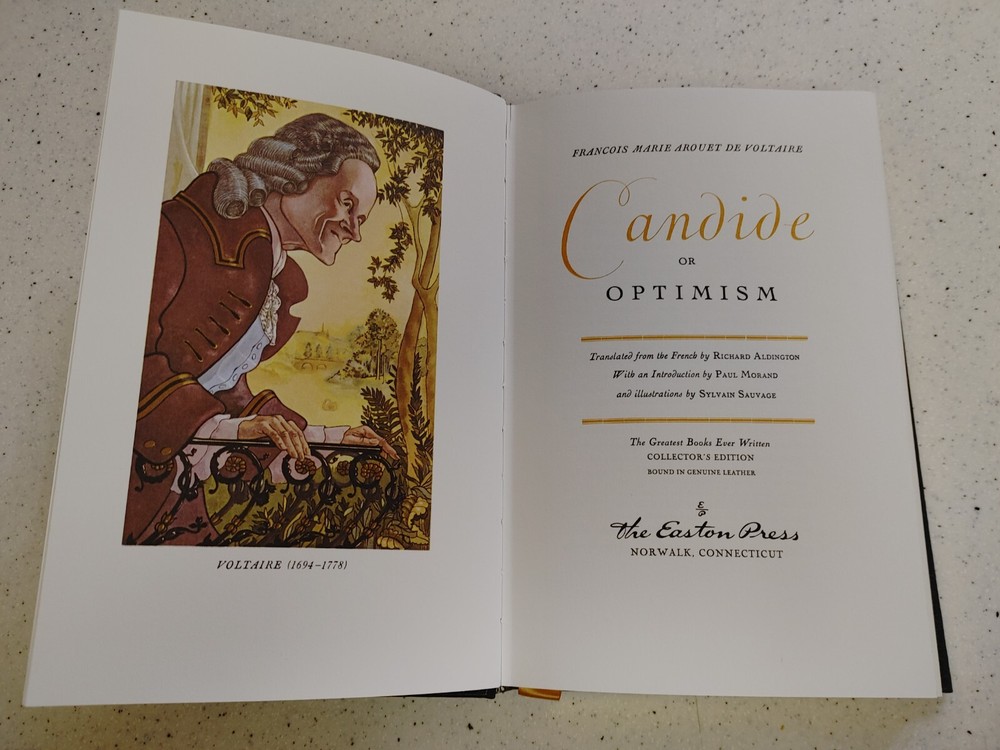 This beautiful book is a true gem for any collector or lover of literature and fiction. With its stunning illustrations by Sylvain Sauvage and its elegant leather binding, it is truly a piece of art. The book is a collector's edition of Voltaire's classic Candide, published by Easton Press in 1977. This book is a must-have for anyone who appreciates the beauty and history of literature, and it would make a wonderful gift for a fellow collector or literature enthusiast. This edition was read once and then kept on a shelf for its beauty. Perfect condition! Kept in a smoke free, pet free, and temperature controlled home.