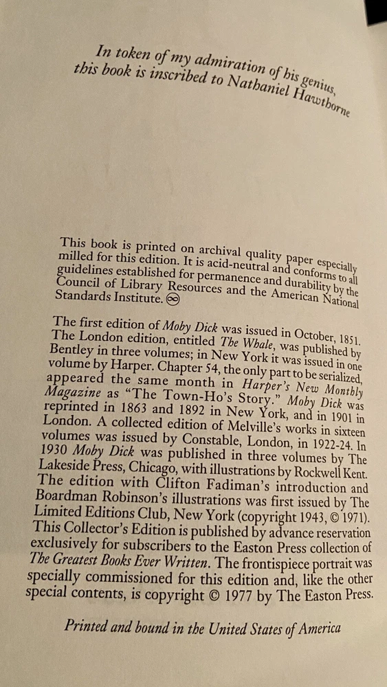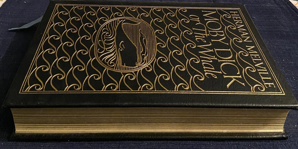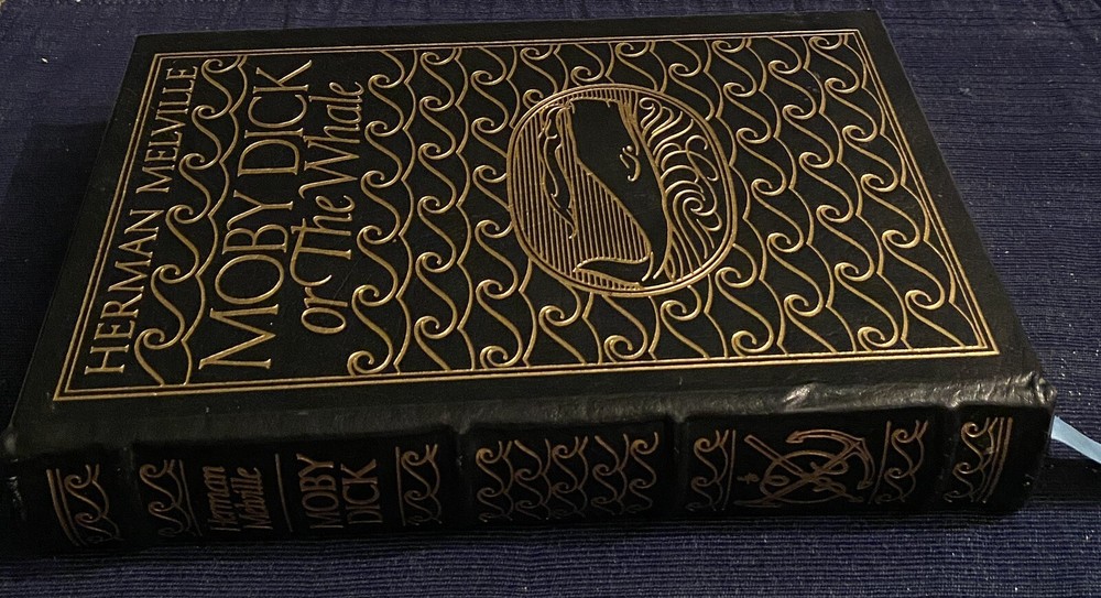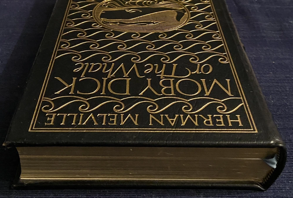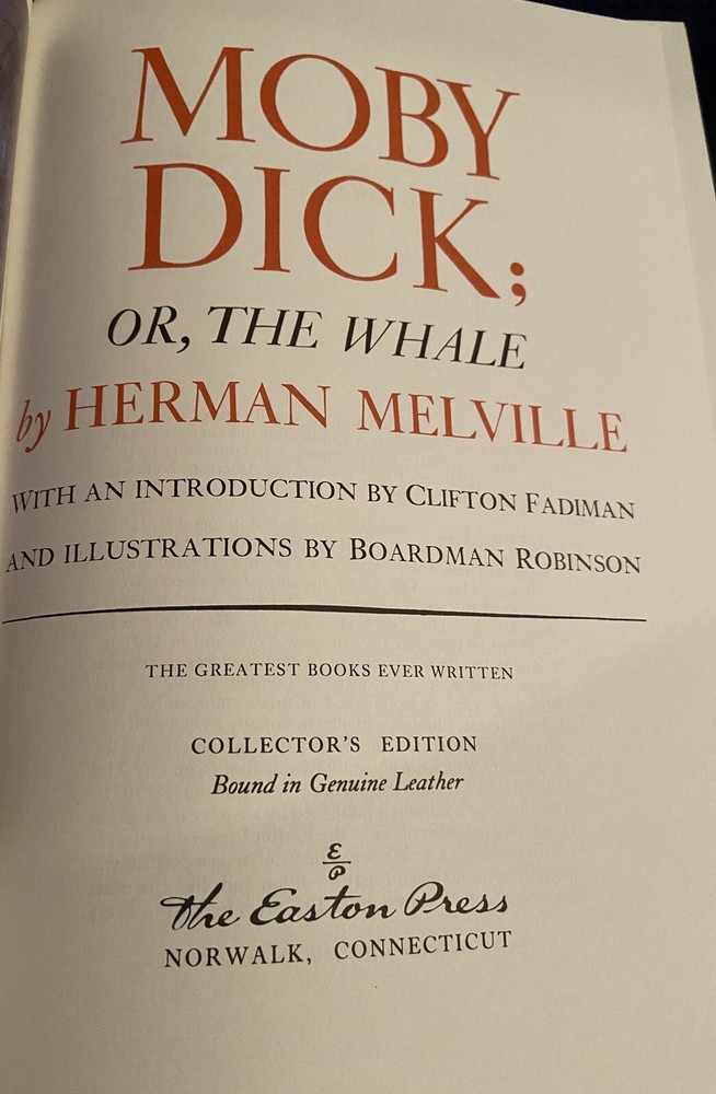 Here is a Beautiful, Near Mint copy MOBY DICK OR THE WHALE bY Herman Melville. Published by the Incomparable Easton Press, this lovely volume has a copyright of 1977 and includes beautiful and striking illustrations by Boardman Robinson. This is included in Easton’s The Greatest Books Ever Written and is a Collectors Edition featuring: —22 kt gold accents and lettering -gold gilded page edges —raised spine bands —silk page marker sewn into the binding —silk end paper From Easton Press Website: “Easton Press is a world-leader in the design and development of fine leather-bound books, stamped on the spine with 22kt gold. For over three decades, we have been serving the needs of collectors to acquire luxurious volumes of lasting meaning, beauty and importance. We take great pride and pleasure in presenting collectors and enthusiasts with a wide variety of heirloom editions, made to exacting standards and meant to be cherished for generations of readers.” This volume is in Near Mint Condition. No apparent markings in the text. Binding is tight and square. Gilded boards are clean and bright. Light bumping. Please see photos. Shipped with USPS Media Mail. Thank you for your consideration.