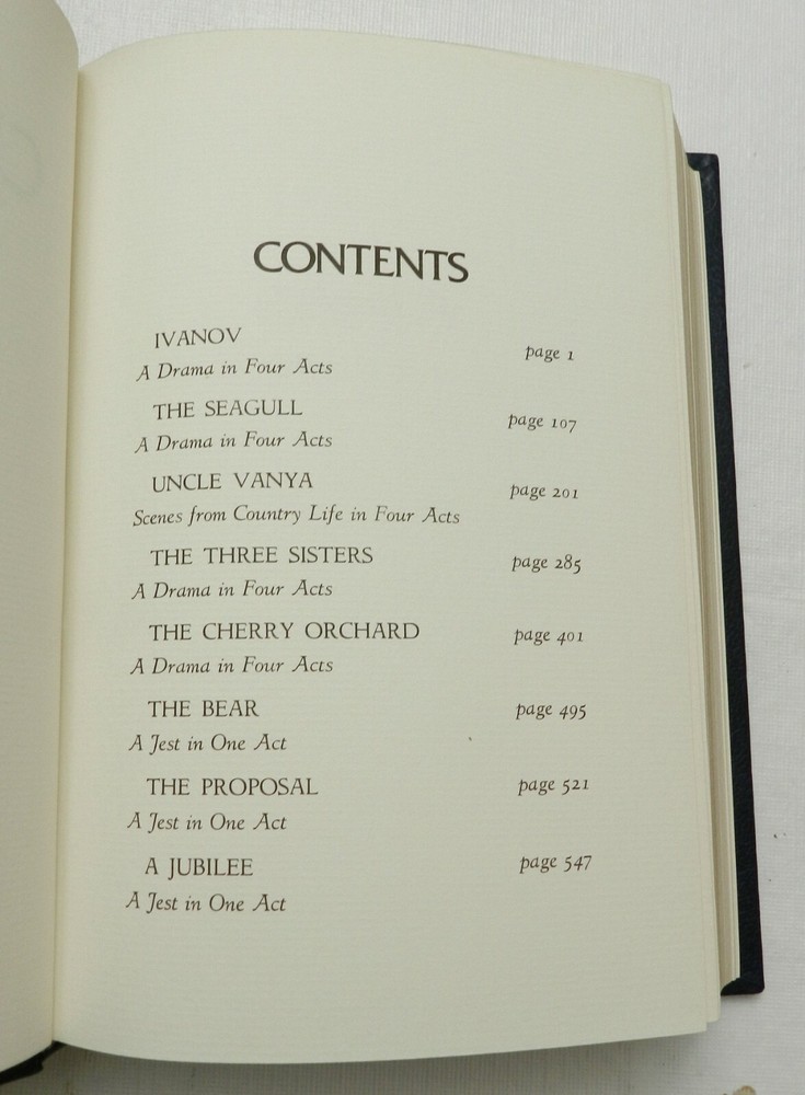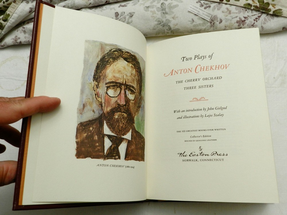 Introduction by John Gielgud. The two plays are, The Cherry Orchard and Three Sisters. Collector's Edition in the 100 Greatest Books Ever Written series. Bound in genuine leather, accented in 22kt gold, printed on archival paper with gilded edges. The endsheets are of moire fabric with a silk ribbon page marker. I LLUSTRATION BY LAJOS SZALAY, 153 pages, LIKE NEW CONDITION. NOTE: Two copies are available, but they are of different colors: Brown color leather (B142) Burgundy color leather (B131) IF YOU HAVE A PREFERENCE, PLEASE SPECIFY.