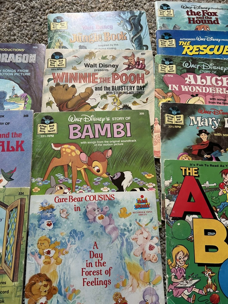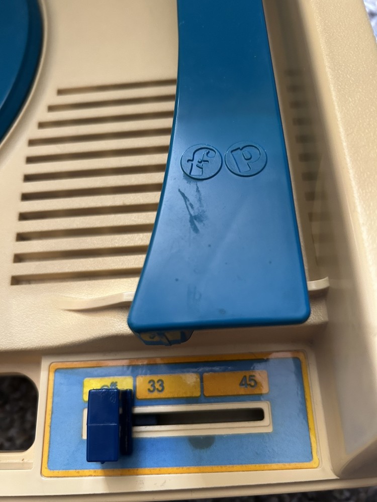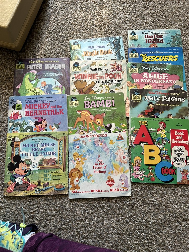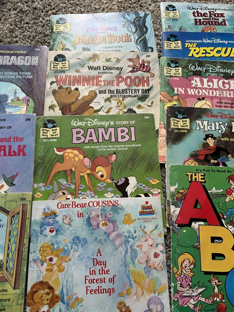 The product is a vintage 1978 Fisher-Price Record Player Turntable from the United States. It includes 15 Read Aloud records and books. 12 of the books are in great shape, 3 more of the books are torn, and one other book is missing the record. Works great.