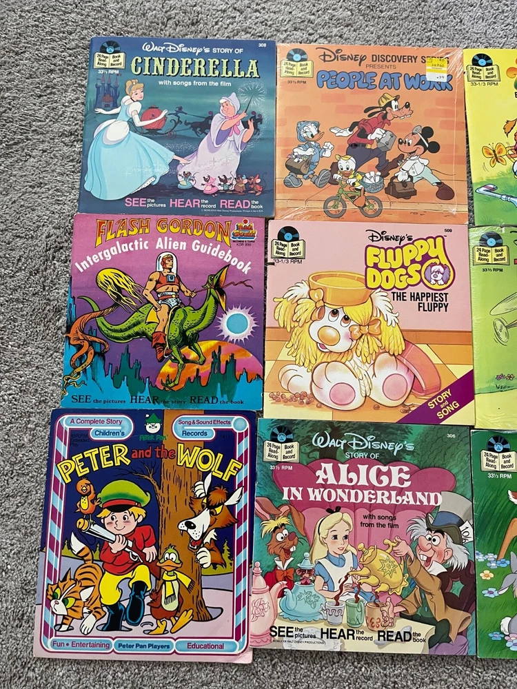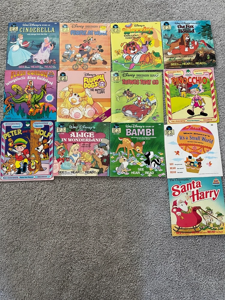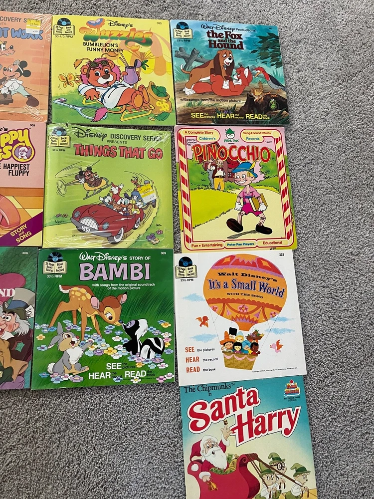 Working 1978 fisher price vinyl player, comes with a mixed lot of Disney and other read along books with play along vinyl records...