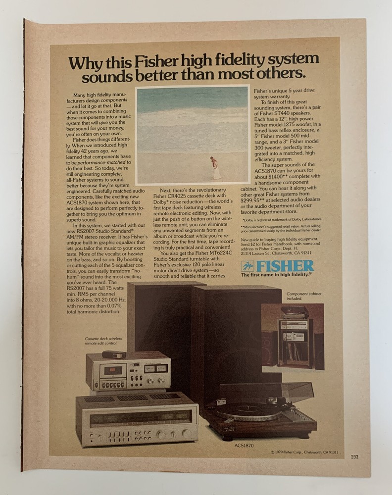 1979 Fisher ACS1870 Hi Fidelity System RS2007 Stereo Receiver Tuner Print Ad Condition is Used. Shipped with USPS First Class Package. Shipped bagged and backed