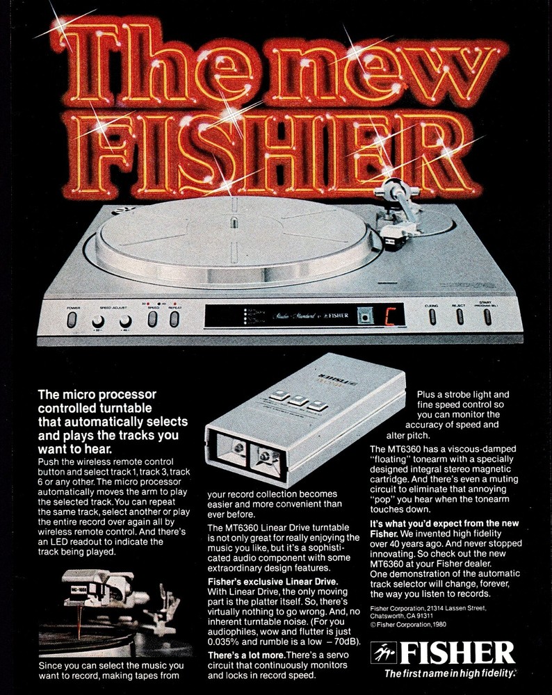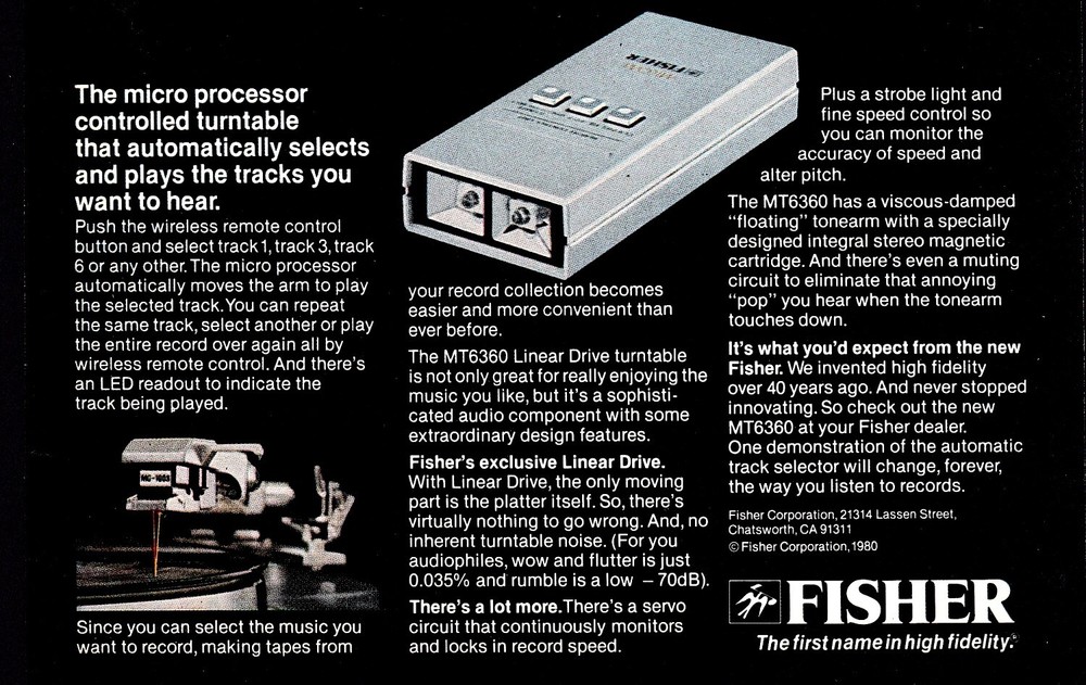 Vintage Print Ad from a 1980 Magazine Fisher MT6360 Linear Drive Turntable 'The new Fisher -- the micro processor controlled turntable that automatically selects and plays the tracks you want to hear.' 8-1/8 " W x 10-5/8" L (approx.) Very good condition. Perfect for framing or collecting. This is an original ad -- not a reprint or reproduction. The scan is not retouched. Ships the next business day with tracking, in rigid packaging, with a clear sleeve and backing board. Additional items ship FREE! Please wait for a revised invoice. Please contact me with any questions. Thank you!