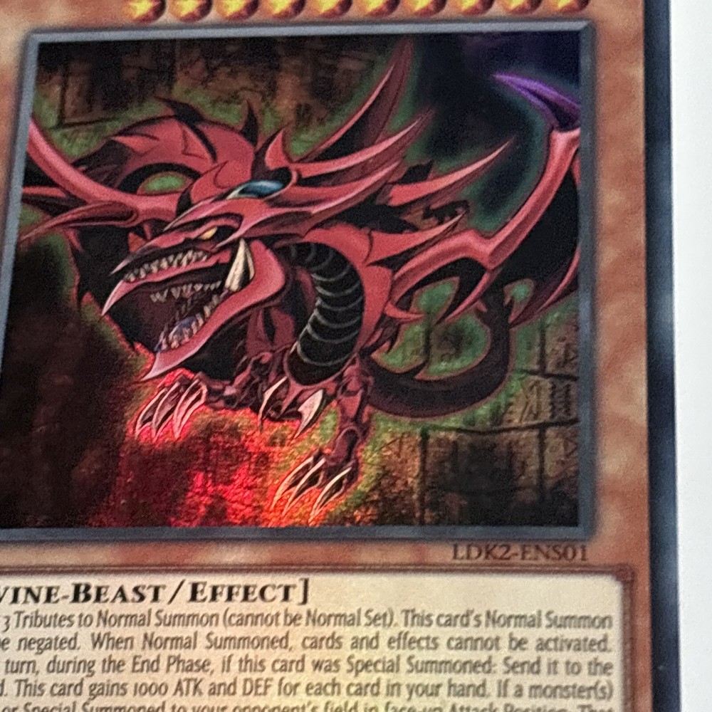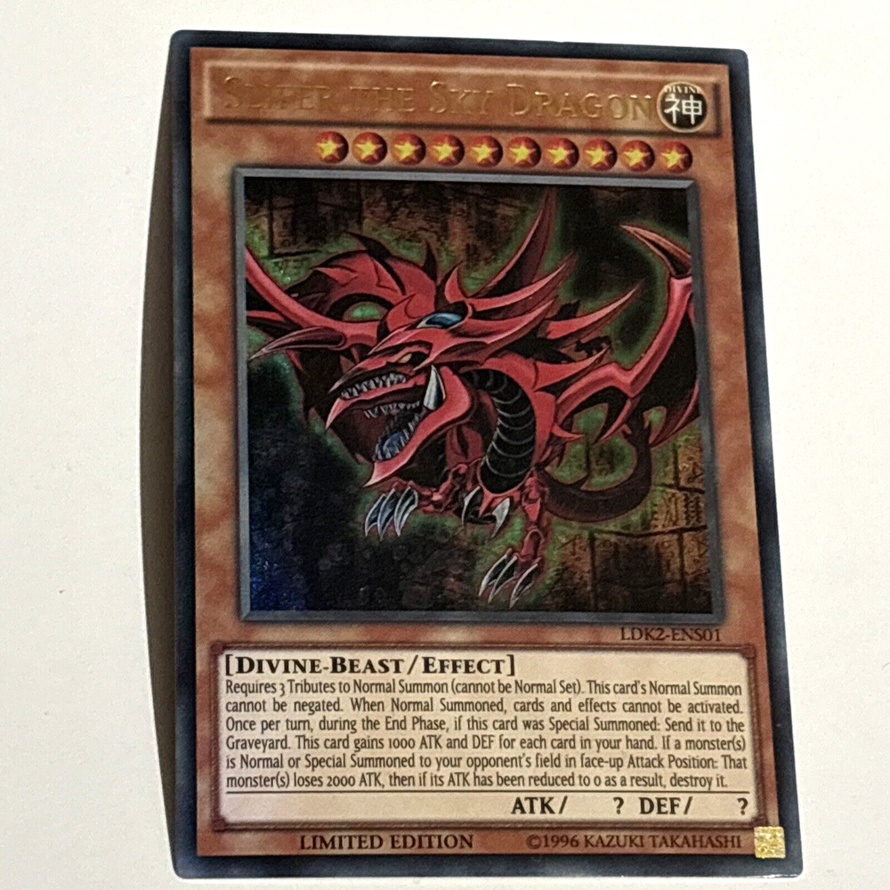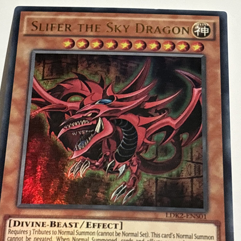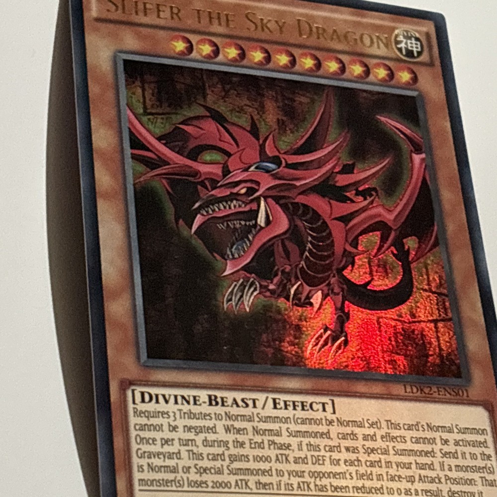 Dive into the world of strategic duels with the iconic Slifer The Sky Dragon card from the Yu-Gi-Oh! TCG. Manufactured by Konami in 1996, this powerful Divine-Beast/Effect card is a staple for any collector or player looking to enhance their deck with a touch of ancient magic. Card Number LDK2-ENS01 features a striking holo finish that brings the enigmatic Slifer to life, captivating onlookers and adding a gleam to your collection. Whether it's for competitive play or the joy of collection, this card is a must-have for enthusiasts of the Yu-Gi-Oh! universe.