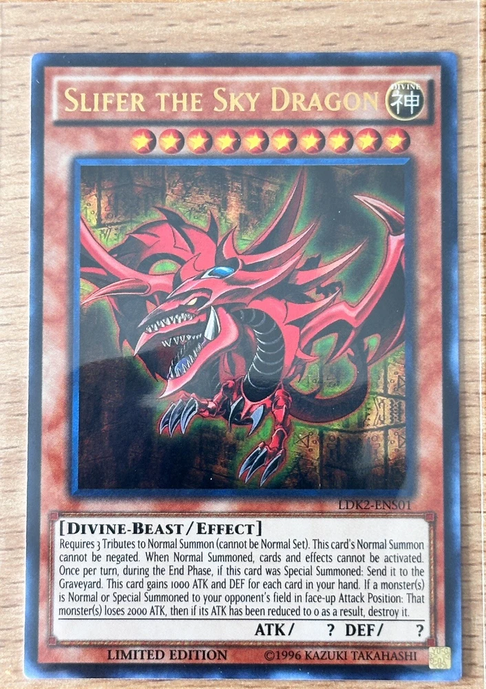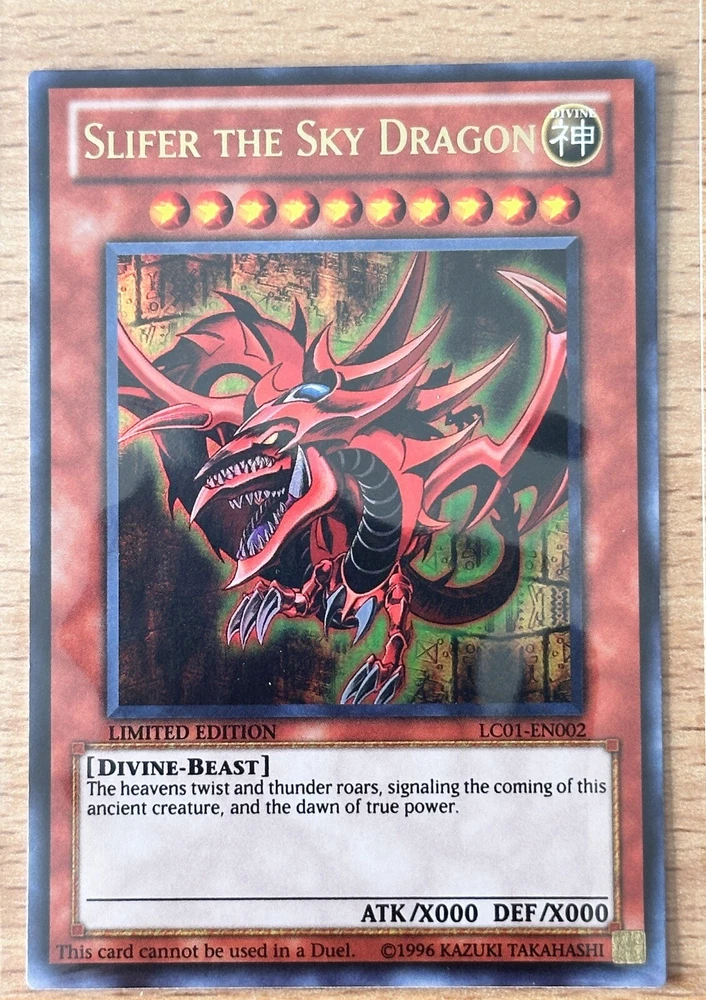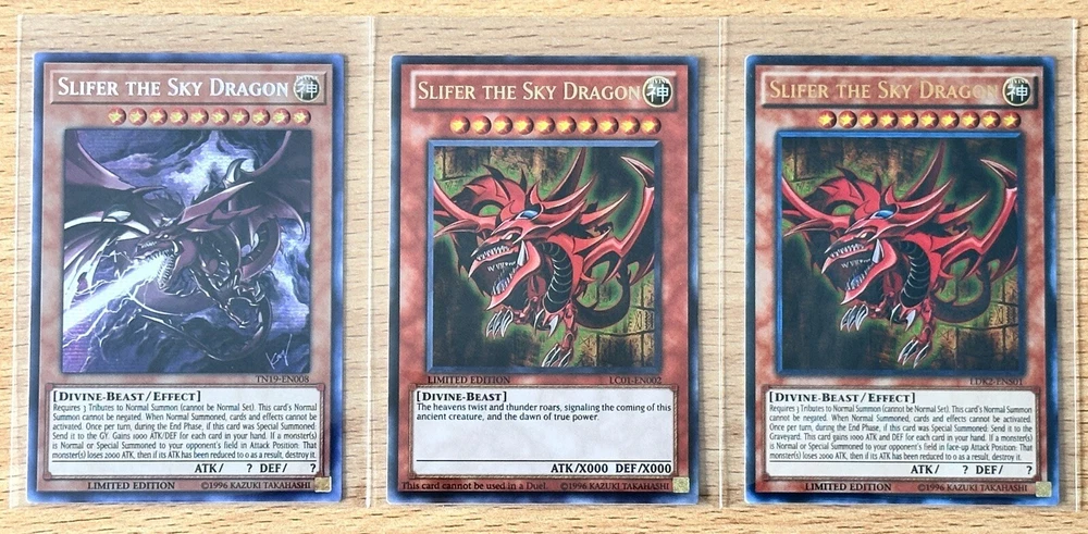 1996 Yugioh Limited Edition Foil Slifer The Sky Dragon 3 Card Lot the darker looking foil card has “ This card cannot be used in a duel “