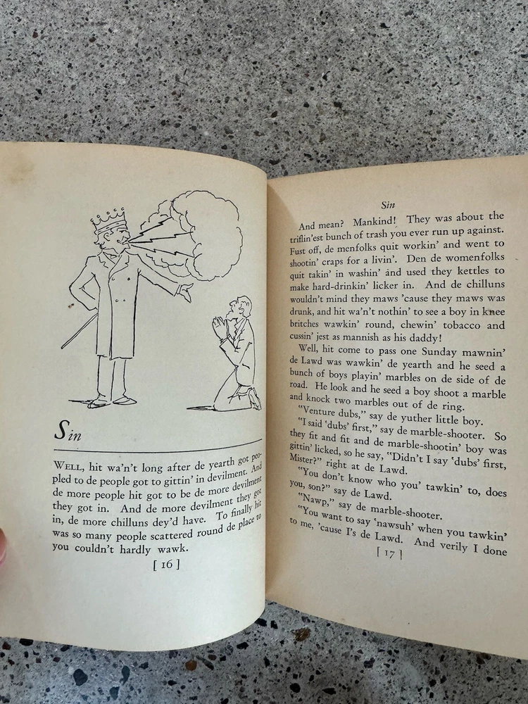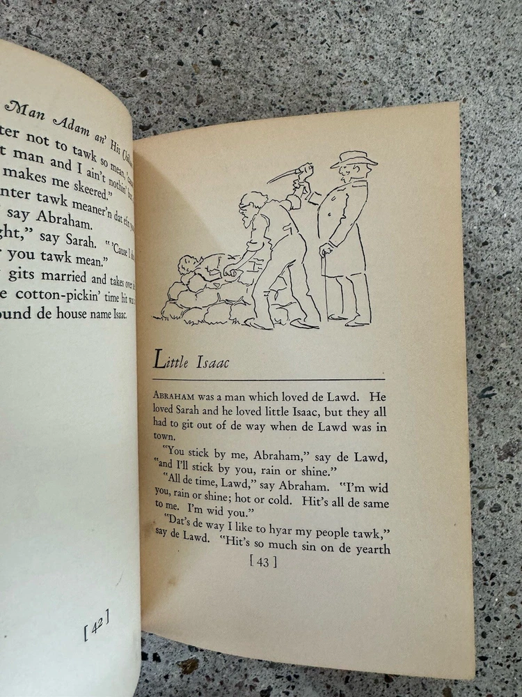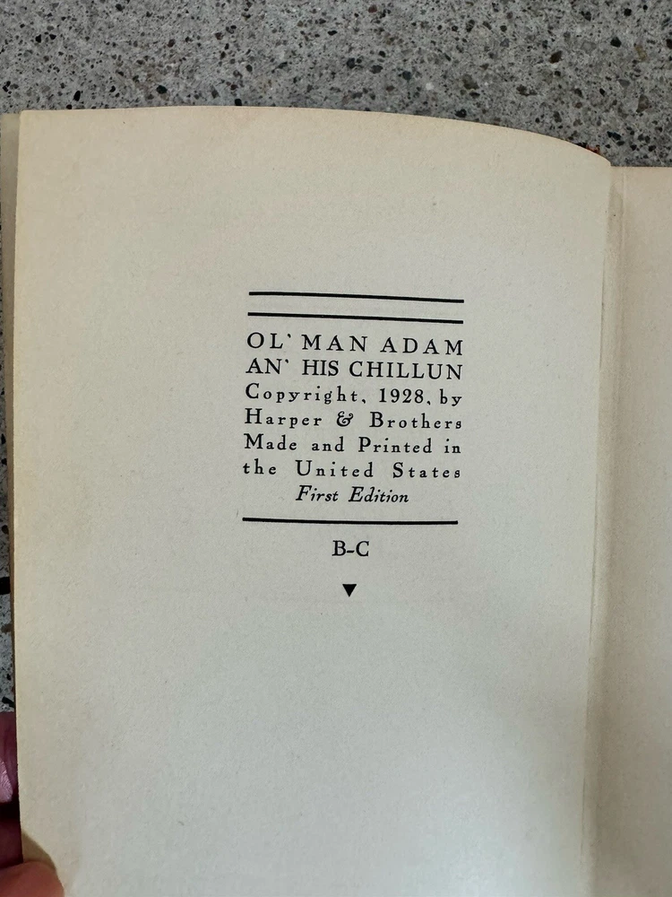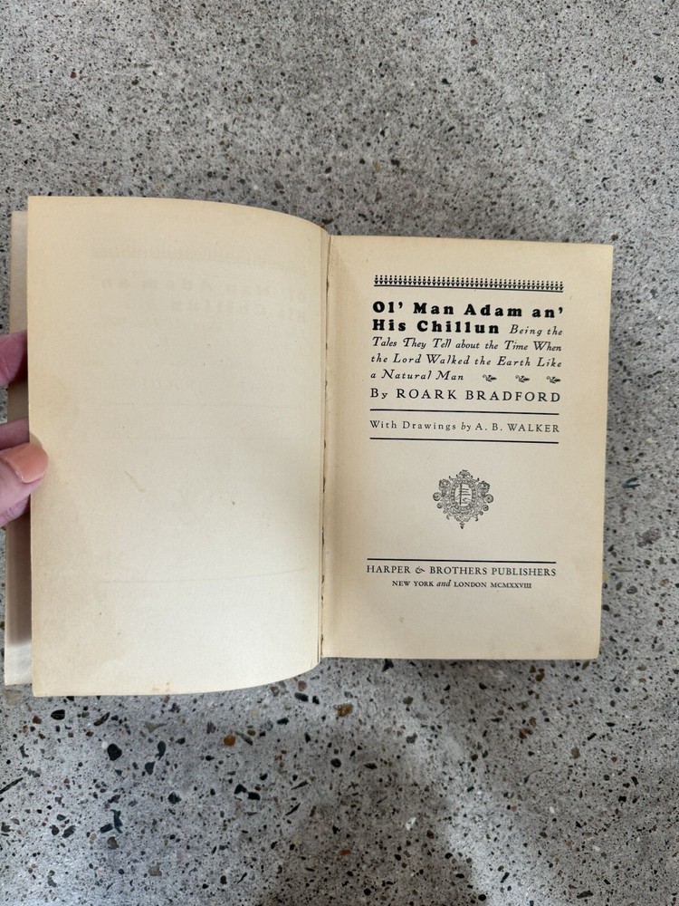 Collectors 1st Edition Leather bound 1st 1st OL' MAN ADAM AN' HIS CHILLUN: INSPIRED ALL BLACK 1936 FILM THE GREEN PASTURES [African American], BRADFORD, ROARK; First Edition [African American Related] BRADFORD, Roark; Drawings by A.B. Walker. OL' MAN ADAM AN' HIS CHILLUN: Being the Tales They Tell about the Time When the Lord Walked the Earth Like a Natural Man. New York and London: Harper & Brothers, Publishers. 1928. First edition, early printing. This book is a collection of African American folk tales done in "a negro dialect" of New Orleans. It is the author's first book. This story was later made into the 1936 movie The Green Pastures, one of only six feature films in the Hollywood Studio era to feature an all-black cast. 8vo., 264 pp., illustrated with black and white drawings. Bradford is a white author who was inspired by African American preachers and recorded sermons of Black proletarian ministers of the time. His main inspiration came from Rev. John Wesley Henning who told imaginative Biblical stories told through the Southern African-American lens