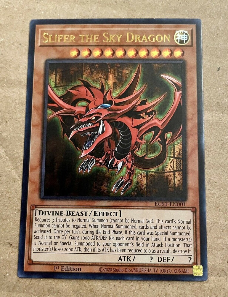 This Yu-Gi-Oh! TCG card, titled "1st Edition Slifer The Sky Dragon," features the Divine-Beast monster type, Divine attribute, and Effect card type. The card stock material and holo finish make it a beautiful addition to any collection. It was manufactured by Konami in Japan and has a Secret Rare rarity.The card is in the 400010 condition type and has the features of 1st Edition. It is a standard size card with card number EGST-EN001 and is printed in English. It is suitable for players aged 10 and above and is not considered vintage. Get your hands on this powerful card and dominate your opponents!