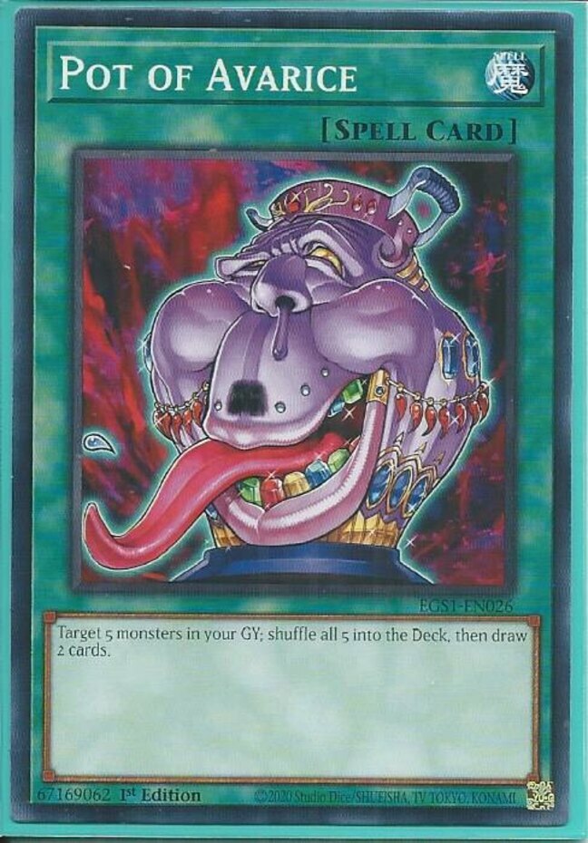 Pot of Avarice - EGS1-EN026 - Common - 1st Edition - Egyptian God Deck: Slifer the Sky Dragon Condition: Near Mint ----------------------------------------------------------------------------------------------------------------------------- The photo used is a STOCK PHOTO Disclaimer: Photo does not always match description. Please read descripition/title before purchasing. For any photo requests, please feel free to contact us! ----------------------------------------------------------------------------------------------------------------------------- Shipping Information: Due to the worldly circumstances; there have been on-going shipping delays We are kindly asking for customer co-operation and understanding during this time. We are currently recommending customers to track their orders for assurance purposes. Lettermail Shipping Estimation: Canada: 10-15 Business Days United States: 10-18 Business Days International: 15-20 Business Days Buyers are responsible for additional fees ie. Customs ----------------------------------------------------------------------------------------------------------------------------- Card Condition Guide: Near Mint (NM) Near Mint condition cards show minimal or no wear from play or handling and will have an unmarked surface, crisp corners, and otherwise pristine edges outside of minimal handling. Near Mint condition cards appear "fresh out of the pack," with edges and surfaces virtually free from all flaws. ----------------------------------------------------------------------------------------------------------------------------- Lightly Played (LP) Lightly Played condition cards can have slight border or corner wear, or possibly minor scratches. No major defects are present, and there are less than 4 total flaws on the card. Lightly Played condition foils may have slight fading or indications of wear on the card face. ----------------------------------------------------------------------------------------------------------------------------- Moderately Played (MP) Moderately Played condition cards have moderate wear, or flaws apparent to the naked eye. Moderately Played condition cards can show moderate border wear, mild corner wear, water damage, scratches, creases or fading, light dirt buildup, or any combination of these defects. ----------------------------------------------------------------------------------------------------------------------------- Heavily Played (HP) Heavily Played condition cards exhibit signs of heavy wear. Heavily Played condition cards may include cards that have significant creasing, folding, severe water damage, heavy whitening, heavy border wear, and/or tearing. ----------------------------------------------------------------------------------------------------------------------------- Damaged (DMG) Damaged condition cards show obvious tears, bends, or creases that could make the card illegal for tournament play, even when sleeved. Damaged condition cards have massive border wear, possible writing or major inking (ex. white-bordered cards with black-markered front borders), massive corner wear, prevalent scratching, folds, creases or tears. ----------------------------------------------------------------------------------------------------------------------------- T hank you for choosing to shop with us! If you were happy with your purchase, feedback is greatly appreciated! YT