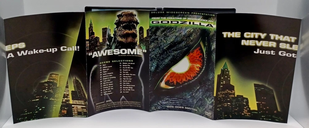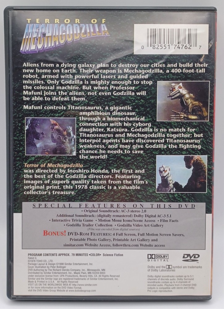 UP FOR SALE; 2 GODZILLA DVD MOVIES - 1978 + 1998 1) " TERROR OF MECHAGODZILLA " 1978 - 79 MINS - COLOR - STANDARD SCREEN, INCLUDES MANY SPECIAL BONUS FEATURES ; INTERACTIVE TRIVIA GAME, MOTION MENU ICONS/SCENE ACCESS, FILM FACTS, GODZILLA TRAILER COLLECTION, GODZILLA VIDEO ART GALLERY, FILM WAS ENCODED FROM DIGITAL SOURCES, BONUS! DVD-ROM FEATURES ; 4 FULL SCREEN, FULL MOTION SCREEN SAVERS, PRINTABLE PHOTO GALLERY, PRINTABLE ART GALLERY, THRU SIMITAR WEBSITE. --------------------------------- 2) " GODZILLA " 1998 - 139 MINS - COLOR - (WS), INCLUDES MANY SPECIAL BONUS FEATURES ; ANIMATED MENUS, THEATRICAL TRAILERS, SCENE SELECTIONS, FEATURETTE , SPECIAL FX SUPERVISOR COMMENTARY, DIRECTOR/PRODUCER BIOGRAPHIES, CAST FILMOGRAPHIES, PHOTO GALLERY, MUSIC VIDEO, GODZILLA TAKES NEW YORK (BEFORE AND AFTER SHOTS). -------------------------------------------------------------------- CONDITIONS ; THESE 2 LIKE NEW DVD MOVIES ARE IN OVERALL (NM+) CONDITION, THEY HAVE BEEN VIEWED 1 TO 2 TIMES EACH MAX, THEN SAFELY STORED, ALL DISCS ARE IN (NM+) CONDITION, THE OUTER BOX CASES HAVE ONLY SOME VERY MINOR SURFACE/CORNER/EDGE STORAGE WEAR, PLEASE EXAMINE PICTURES FOR MORE CONDITION DETAILS. ************************************************************************************************************************************************************* TERMS AND CONDITIONS OF SALE ************************************************************************************************************************************************************* IF YOU PLAN ON PURCHASING MORE THAN 1 ITEM, WE RECOMMEND THAT YOU USE THE EBAY SHOPPING CART, THEN REQUEST AN INVOICE WHEN READY, OR KINDLY CONTACT US TO INFORM THAT YOU ARE DONE SO WE CAN SEND A FINAL INV OICE WITH COMBINED SHIPPING TO SAVE YOU MONEY!!! PAYMENT; PLEASE MAKE PAYMENT WITHIN 2 DAYS OF PURCHASE OR RECEIPT OF OUR INVOICE, OR IN THE CASE OF A PURCHASE WITH BUY-IT-NOW THEN IMMEDIATE PAYMENT IS REQUIRED . ************************************************************************************************************************************************** SHIPPING; WE WILL ONLY SHIP TO CANADA AND UNITED STATES, WE WILL GLADLY COMBINE MULTIPLE PURCHASES TO SAVE BUYER MONEY ON SHIPPING, ITEM/S WILL BE PACKAGED PROPERLY AND SAFELY FOR SHIPPING, PLEASE REVIEW OUR +FEEDBACKS FOR VERIFICATION. U.S.A. BUYERS ARE RESPONSIBLE FOR ANY U.S. CUSTOMS OR IMPORT DUTIES/FEES, IF ANY. ITEMS WILL BE SHIPPED VIA A CANADA POST OR A FED-EX SHIPPING SERVICE, WHICH INCLUDE A TRACKING# & $100.00 INSURANCE COVERAGE. PLEASE USE EBAY'S SHIPPING CALCULATOR ON THIS PAGE FOR SHIPPING QUOTE AND ESTIMATED SHIPPING TIMES. SHIPPING TO CANADA WILL BE VIA ; " CANADA POST - EXPEDITED PARCEL - CANADA ” OR "FED-EX - EXPRESS ECONOMY" _____________________________________________________________________________________________________________ SHIPPING TO USA WILL BE VIA ; " CANADA POST - TRACKED PACKET - USA ” OR "FED-EX - INTERNATIONAL ECONOMY" ************************************************************************************************************************************************** HANDLING TIME; ITEM/S WILL BE SHIPPED OUT WITHIN 2 BUSINESS DAYS FROM RECEIPT OF FULL CLEARED PAYMENT, WE USUALLY SHIP THE SAME DAY OR NEXT BUSINESS DAY AT THE LATEST. ************************************************************************************************************************************************************** FEEDBACK & DETAILED SELLERS RATINGS; PLEASE CONFIRM RECEIPT OF YOUR PURCHASED ITEM/S AND SATISFACTION BY LEAVING US POSITIVE FEEDBACK & DETAILED SELLER RATINGS, WE PROMPTLY RETURN ALL POSITIVE FEEDBACKS LEFT FOR US, IF SOMETHING IS WRONG PLEASE CONTACT US BEFORE LEAVING FEEDBACK, SO ISSUE CAN BE RESOLVED. WE ENCOURAGE BUYERS TO ASK QUESTIONS BEFORE BUYING, ITEM/S ARE SOLD IN " AS IS CONDITION ", SO WE HAVE PROVIDED DETAILED, ACCURATE DESCRIPTIONS & PHOTOS FOR NO-WORRY PURCHASES, SMOKE & PET FREE HOME. ***************************************************************************************************************************************************************