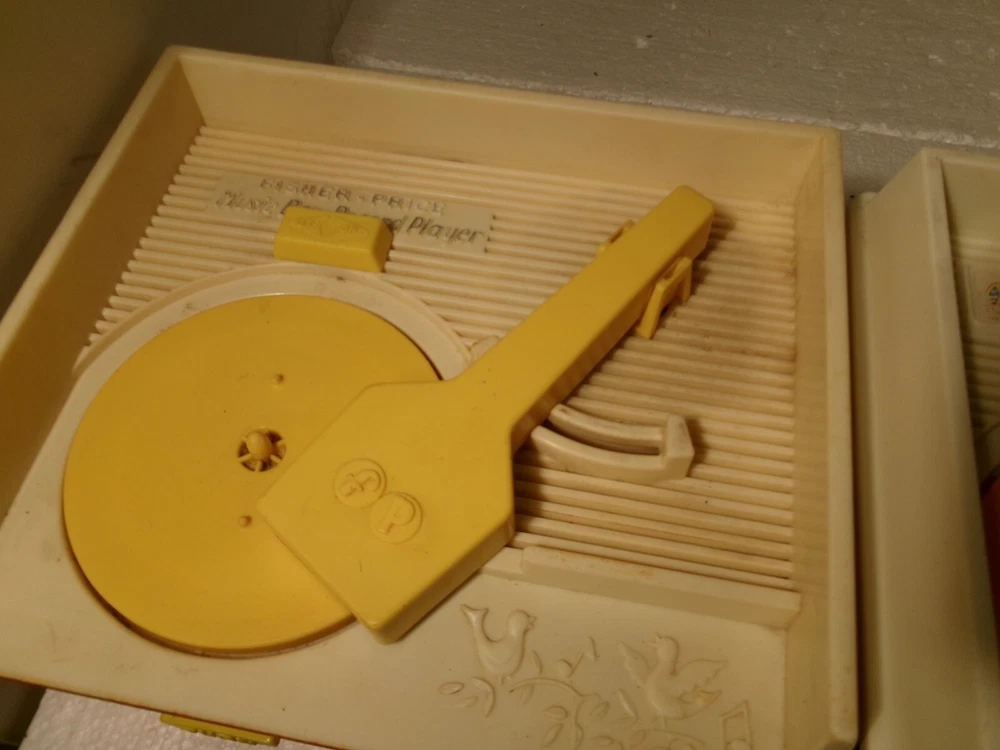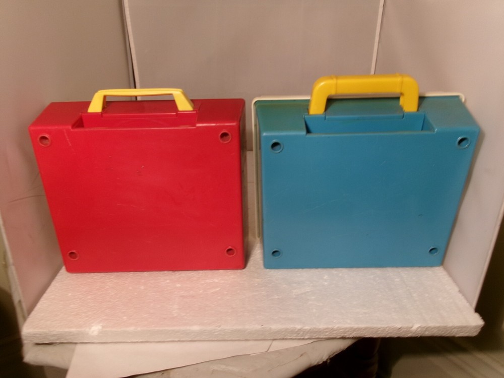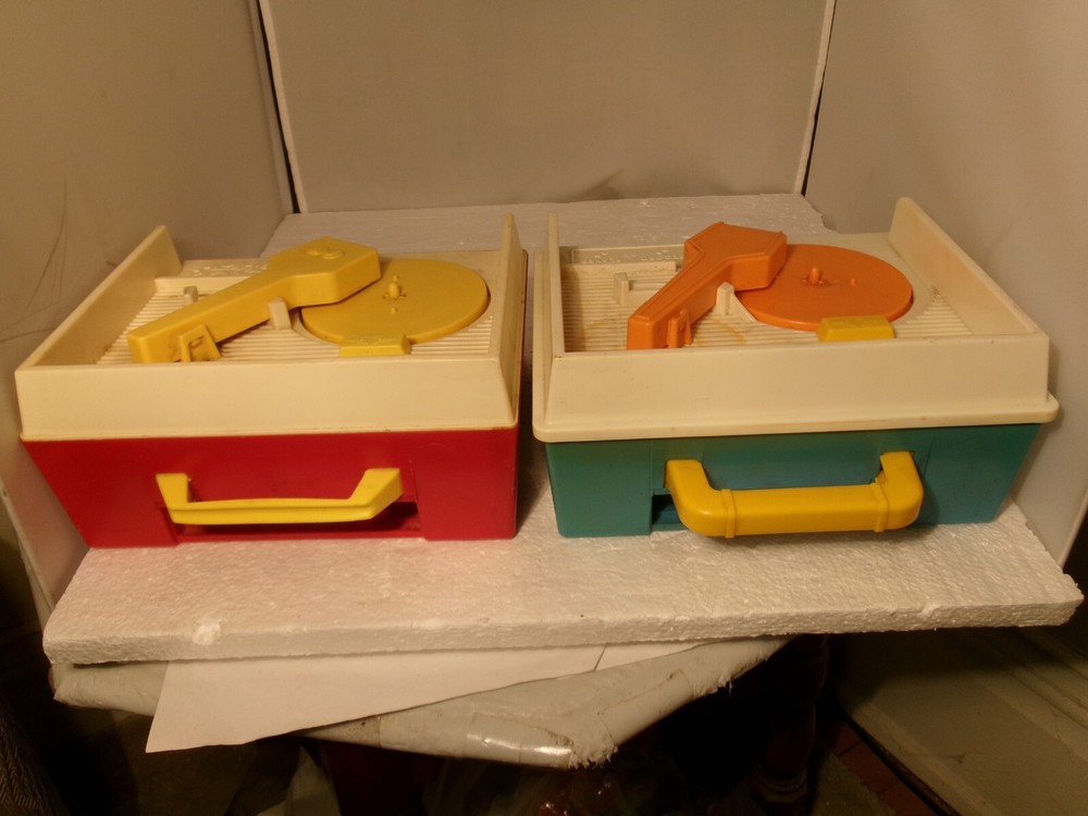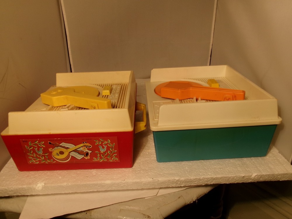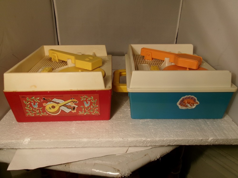 Here's two vintage Fisher Price Music Box Record Players. The older red and white one is no. #995 from 1971. The newer blue and white one is no. 2205 from 1987. Selling as is for parts or repair as I did not have any records to test them out. Both might actually be just fine I just don't know 100%. Both of these record players wind up and they do appear to work as both turntables spin as they should and stop spinning about the same time wise after the windup is over. The older one (red one) appears to have a slower spin than the newer one (blue one). I'm not sure if that was how it's designed or not but wanted to mention it as the could possibly indicate a problem when playing the records. Again, I did not have any records to test these out sound wise so decided to just sell them together. Selling as is. Please look over all the photos carefully and thank you for looking.