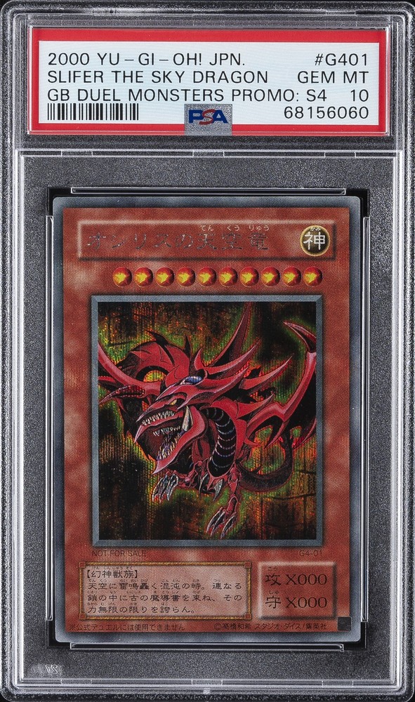 2000 YU-GI-OH! JAPANESE GAMEBOY DUEL MONSTERS PROMOS: SER. 4 #G401 SLIFER THE SKY DRAGON PSA 10 2000 YU-GI-OH! JAPANESE GAMEBOY DUEL MONSTERS PROMOS: SER. 4 #G401 SLIFER THE SKY DRAGON PSA 10 Purchase Info Thank you for your interest in this item consigned with PSA! By purchasing or making an offer on this item, you acknowledge and agree to the following terms: All sales are final. Returns not accepted. Payment must be made upon purchase of the item. All items are sold "as is" and without warranty of Collectors Universe, Inc. (d/b/a PSA), and ANY AND ALL IMPLIED WARRANTIES ARE DISCLAIMED AND EXCLUDED. Sales tax may apply depending on shipping address. PSA does not guarantee that another third-party grading company's authentication or certification of an item as genuine is correct or accurate. Neither a difference of opinion between third-party grading companies about authenticity, nor a company's subsequent reversal of its earlier authentication or certification of an item, will be a basis for rescinding a sale. Any dispute with another third-party grading company relating to the authenticity of an item must be resolved directly with that other company. Collectors' maximum liability in the event of loss or damage to an item during shipping will be the lesser of (a) the price paid for the item and (b) the change in fair market value of the item. You release Collectors from all other liability including for any claims of punitive damages, emotional distress, consequential damages, lost profits, or lost interest, except as prohibited by law. Shipping Purchased Items will be shipped directly from PSA Vault. You stay hands-free. PSA Vault When you purchase this item, you can save on sales tax and selling fees by keeping it in the PSA Vault, official Vault of eBay. Items already in PSA Vault and will be sent to PSA Vault will have no shipping charge Storage of any items with the PSA Vault will be subject to the PSA Vault Terms of Service. Consignment PSA has competitive rates on the world's largest collectibles marketplace with the option to list from the PSA Vault or immediately after PSA authentication and grading. Sale Price Under $100 $100 - $499 $500 - $999 $1,000 - $2,499 $2,500 - $4,999 $5,000+ Seller Fee 16% 14% 13% 10% 9% 7% Sellers pay a single fee as reflected above; no additional eBay fees are incurred. There is a $5 minimum fee on sold items.