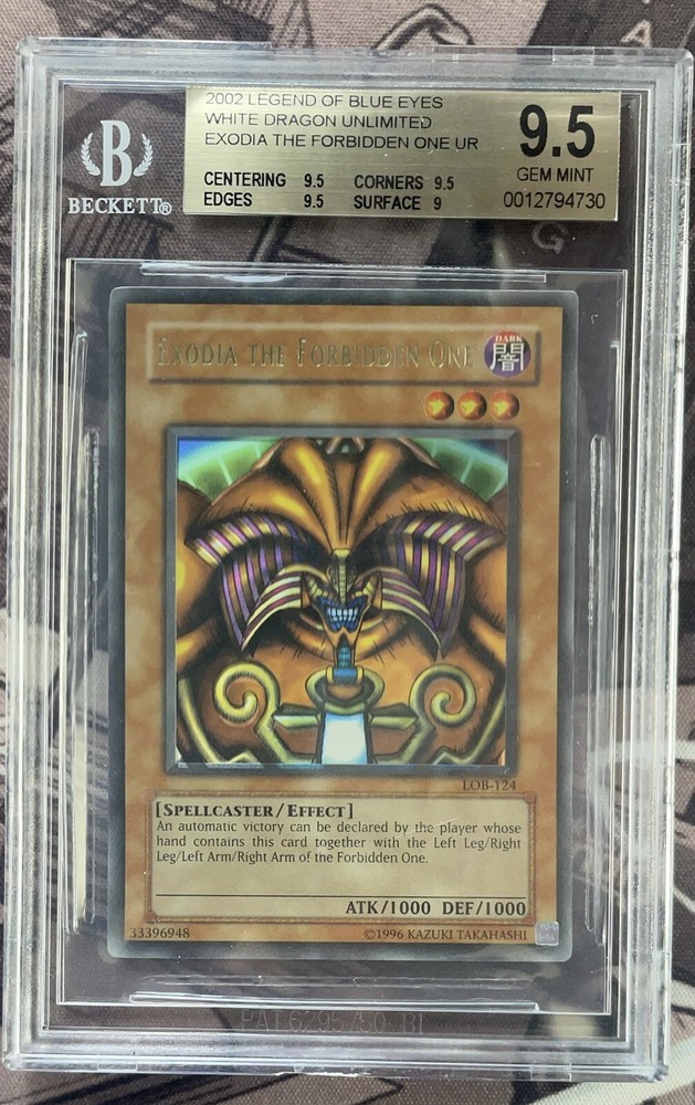 This ultra-rare 2002 Exodia The Forbidden One card from the Yu-Gi-Oh! franchise is an excellent addition to any trading card collection. Graded at BGS 9.5, this Non-Sport Trading Card single is sure to impress. It is a must-have for fans of the Yu-Gi-Oh! franchise and collectors who appreciate high-quality, rare items. Bid with confidence and add this prized item to your collection today.