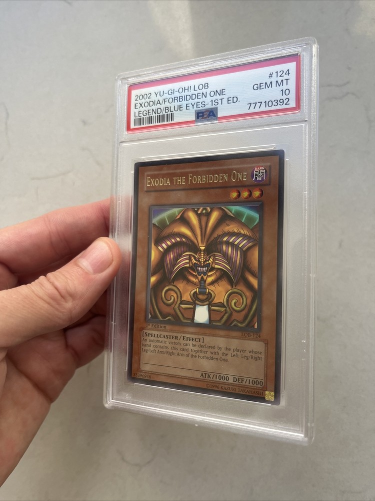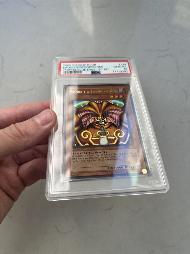 2002 Exodia the Forbidden One 1st Edition LOB-124 PSA 10 Gem Mint Glossy. Condition is Graded. Shipped with USPS Ground Advantage. Get 10% off when buying through us directly! Contact us on social media. Or if you want to buy on TCGplayer (eBay owned) we can also do 10% less. They have lower selling fees than this god forsaken platform. Thanks!