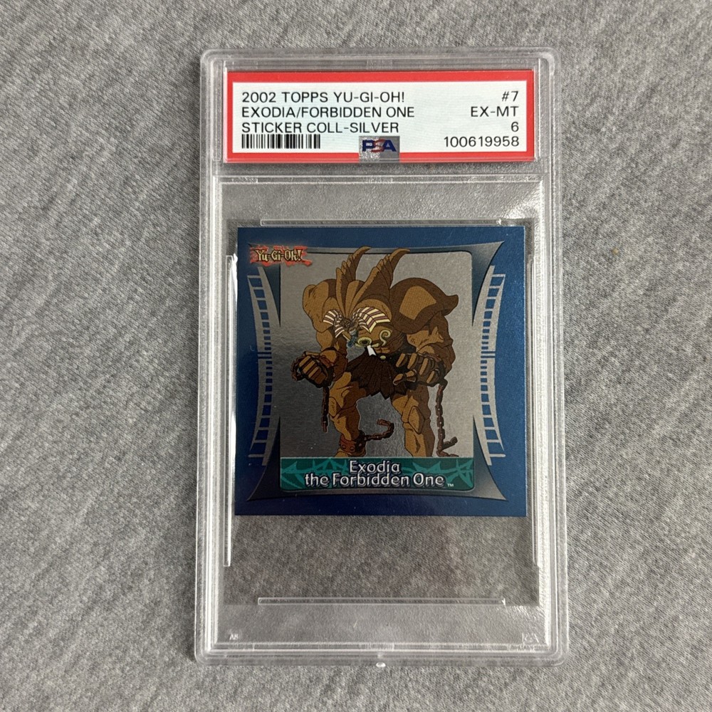 2002 Topps Yu-Gi-Oh! Sticker Collection #7 Exodia the Forbidden One Silver PSA 6 Item Details A picture says a thousand words, please refer to pictures for full condition and specific item details. Please note that you are purchasing the exact contents pictured and only what is pictured. If it is not pictured, then it is not included in this listing. Assume major cosmetic wear; scratches, chips, cuts, cracks, dents, and dings on any part of any item that is not pictured. It is your responsibility as the buyer to obtain any information prior to completing your purchase. If you have any questions or concerns, please ask and we will respond as soon as possible. Best offers will not be considered if sent through an eBay message. Remember we are human, and errors do happen, we are here to provide the best experience and are willing to help where we can. Please understand that all issues that may arise or you are experiencing will be handled according within normal business hours. Any requests made after an item is purchased will be decided upon by our discretion, we reserve the right to cancel any order. Shipping Please note that items are shipped Monday-Friday. All items will be shipped the most cost-efficient way via USPS, FedEx, or UPS. Please note that we only offer free shipping to the 48 continental states. We do not ship directly to Alaska, Hawaii, APO, FPO, or PO boxes. Any purchase with the use of a restricted shipping address will be cancelled. Shipping address cannot be altered after purchase as per eBay policy. All international items will be shipped using the Global Shipping Program Only. Local pick up is not offered for any listing. Please contact us before completing purchase if you have any special requests or concerns, we are willing to complete the necessary accommodations within the best of our abilities. Returns Please note that returns are to be handled directly according to the selected return policy. Any new, sealed, unopened, or items altered in any way are not eligible for return. All returns are subjected to a 20% restocking fee, where applicable. Return shipping cost is the buyers responsibility.