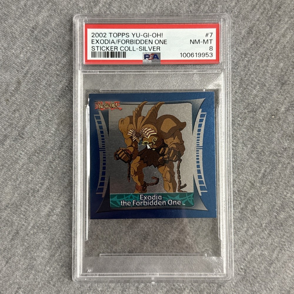 2002 Topps Yu-Gi-Oh! Sticker Collection #7 Exodia the Forbidden One Silver PSA 8 Item Details A picture says a thousand words, please refer to pictures for full condition and specific item details. Please note that you are purchasing the exact contents pictured and only what is pictured. If it is not pictured, then it is not included in this listing. Assume major cosmetic wear; scratches, chips, cuts, cracks, dents, and dings on any part of any item that is not pictured. It is your responsibility as the buyer to obtain any information prior to completing your purchase. If you have any questions or concerns, please ask and we will respond as soon as possible. Best offers will not be considered if sent through an eBay message. Remember we are human, and errors do happen, we are here to provide the best experience and are willing to help where we can. Please understand that all issues that may arise or you are experiencing will be handled according within normal business hours. Any requests made after an item is purchased will be decided upon by our discretion, we reserve the right to cancel any order. Shipping Please note that items are shipped Monday-Friday. All items will be shipped the most cost-efficient way via USPS, FedEx, or UPS. Please note that we only offer free shipping to the 48 continental states. We do not ship directly to Alaska, Hawaii, APO, FPO, or PO boxes. Any purchase with the use of a restricted shipping address will be cancelled. Shipping address cannot be altered after purchase as per eBay policy. All international items will be shipped using the Global Shipping Program Only. Local pick up is not offered for any listing. Please contact us before completing purchase if you have any special requests or concerns, we are willing to complete the necessary accommodations within the best of our abilities. Returns Please note that returns are to be handled directly according to the selected return policy. Any new, sealed, unopened, or items altered in any way are not eligible for return. All returns are subjected to a 20% restocking fee, where applicable. Return shipping cost is the buyers responsibility.