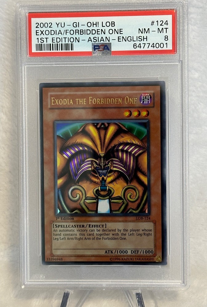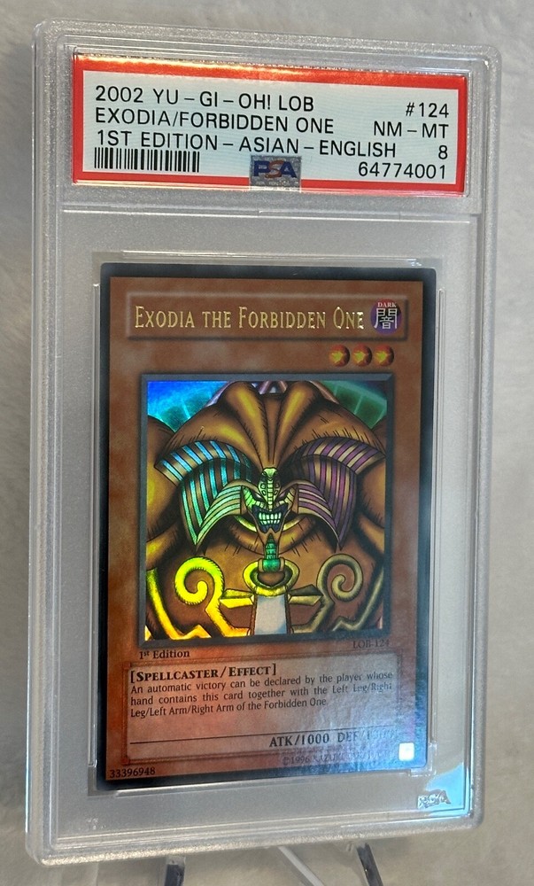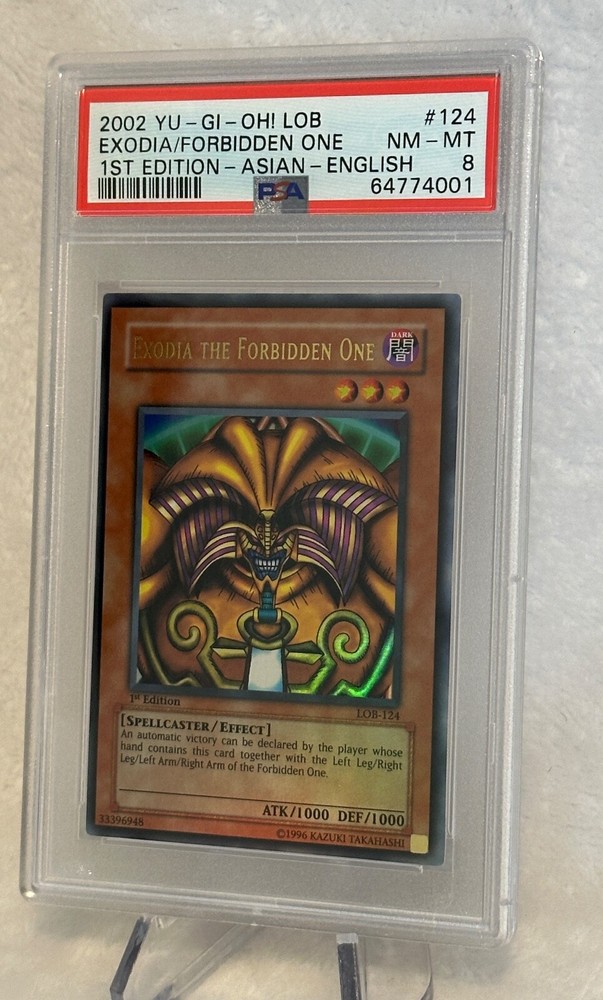 This 2002 Yu-Gi-Oh! card features the legendary Exodia, from the Yugi set and manufactured by TCG. The card is in English and is a 1st edition, a highly sought-after feature for collectors. It has been graded a PSA 8 NM-MT and is ready for display or use in your next battle. This card is perfect for fans of the Yu-Gi-Oh! TCG looking to add a rare and valuable card to their collection. Don't miss this opportunity to own a piece of gaming history. This item will ship in protective packaging in box for damage free delivery. Please message with any questions. Thank you for viewing my listing.