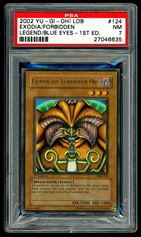 DESCRIPTION! Up for sale is a 2002 Yu-Gi-Oh! The Legend Of Blue-Eyes White Dragon LOB-124 Exodia The Forbidden One 1st Edition Ultra Rare North American English PSA 7 NM! Get It Before It's Gone! Due to an increased number of unpaid items and cancelled purchases, Payment/buyer communication is expected within 48 hours. An unpaid item case will be automatically opened after that. Under no circumstances will an accepted offer or Buy it Now be cancelled. It will simply become an unpaid item case after 48 hours.