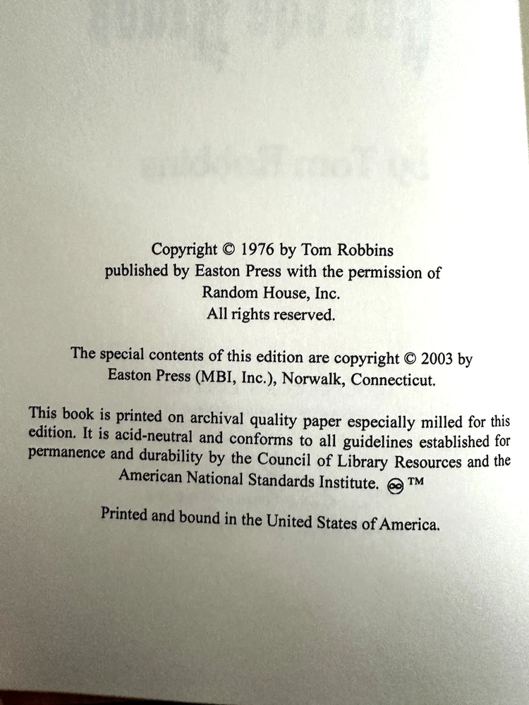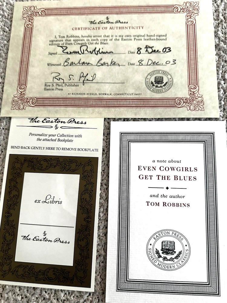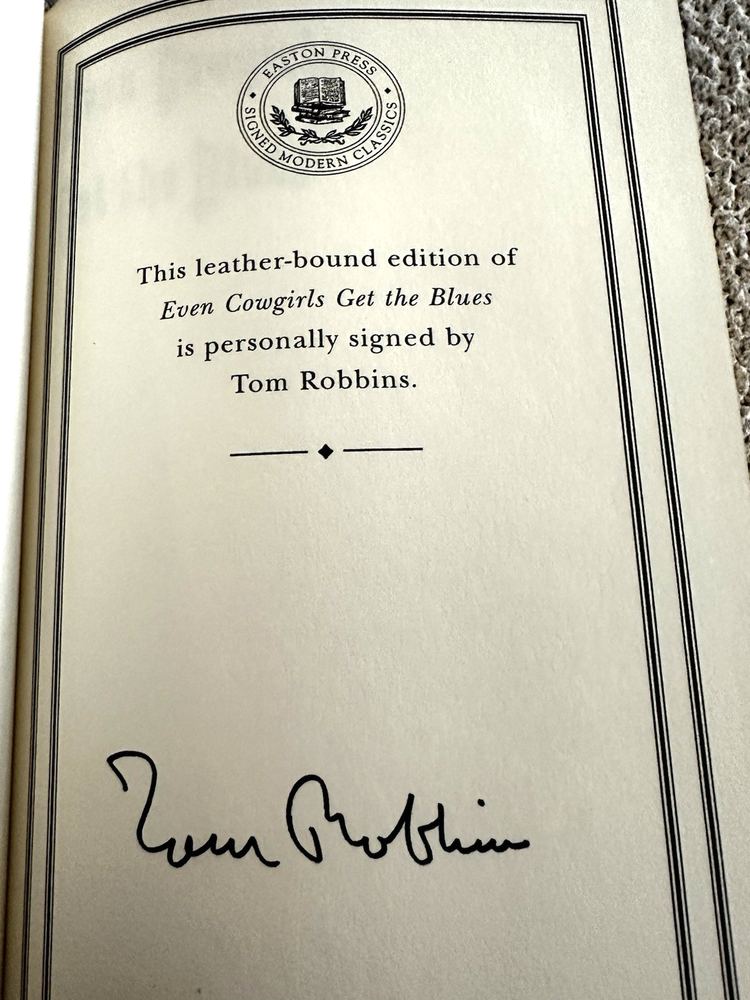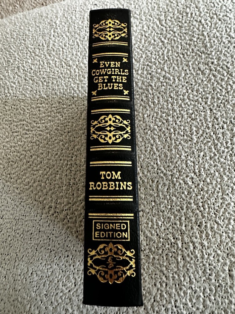 2003 Collector's Edition Signed Easton Press Even Cowgirls Get the Blues Tom Robbins (see photo) Fine condition Leather Gilded pages Satin page marker pp. 365 Dimensions: 8 3/4" x 5 3/4" x 2" Even Cowgirls Get the Blues by Tom Robbins is a 1976 novel blending humor, romance, and philosophical musings. It follows Sissy Hankshaw, a woman with oversized thumbs who uses her hitchhiking prowess to navigate a chaotic world of love, freedom, and self-discovery. From her modeling career to her adventures with a cowgirl commune and a Native American mystic, the story explores themes of individuality, feminism, and the American counterculture. Robbins’ playful, irreverent style mixes absurd plot twists with sharp social commentary.