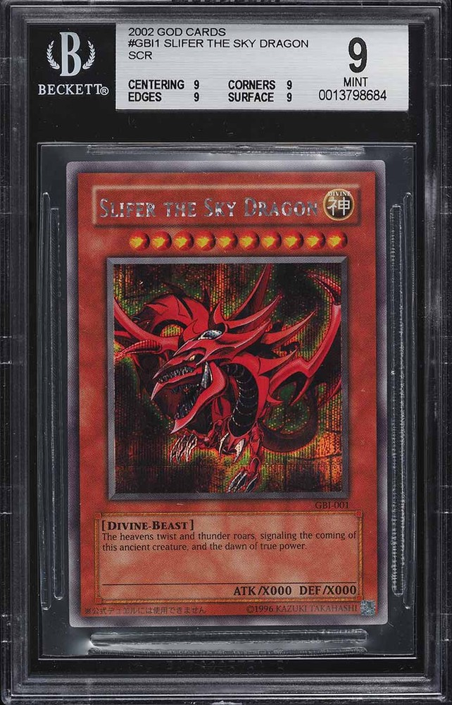 Description Condition: BGS 9 MINT Availability: In Stock You are Purchasing 2003 YUGIOH GBI-001 SLIFER THE SKY DRAGON SECRET RARE BGS 9 MINT #0013798684 Professionally graded by Sportscard Guaranty Corporation (SGC) *PLEASE REVIEW PHOTO(S) BEFORE PURCHASING >>CHECK OUT OUR OTHER POKEMON<< >>PSA CARDS ON AUCTION<< IG: CARD_RUSH_INC Payment Options Payment is expected within 2 weeks of your purchase date. We accept all forms of payments through Paypal. Shipping and Handling We ship to all U.S. states, U.S. territories, APO/FPO locations and any international countries listed under our "ship to" heading. Shipping and Handling is calculated based on the combined shipping weight of your item(s). Please use the shipping calculator to estimate your shipping and handling charges. In order to qualify for combined shipping terms, all items must be paid for in one payment; please do not pay until you are done bidding/shopping. Please contact us if you have any questions regarding our shipping and handling terms. Shipping and Delivery Packages are shipped out every Monday, Wednesday, and Friday. Domestic Packages take approximately 2-7 days to arrive. International packages may take a little longer to arrive, typically 1-4 weeks. Please allow ample transit times before inquiring about your package, thank you. Sales Tax Sales tax will be automatically collected by Ebay. Customer Service We will make every effort to get your purchase is mailed in a timely manner. Please contact us if you have any questions or concerns; we would love to hear any suggestions you have on how we can improve your eBay experience. Thank you for visiting us today.