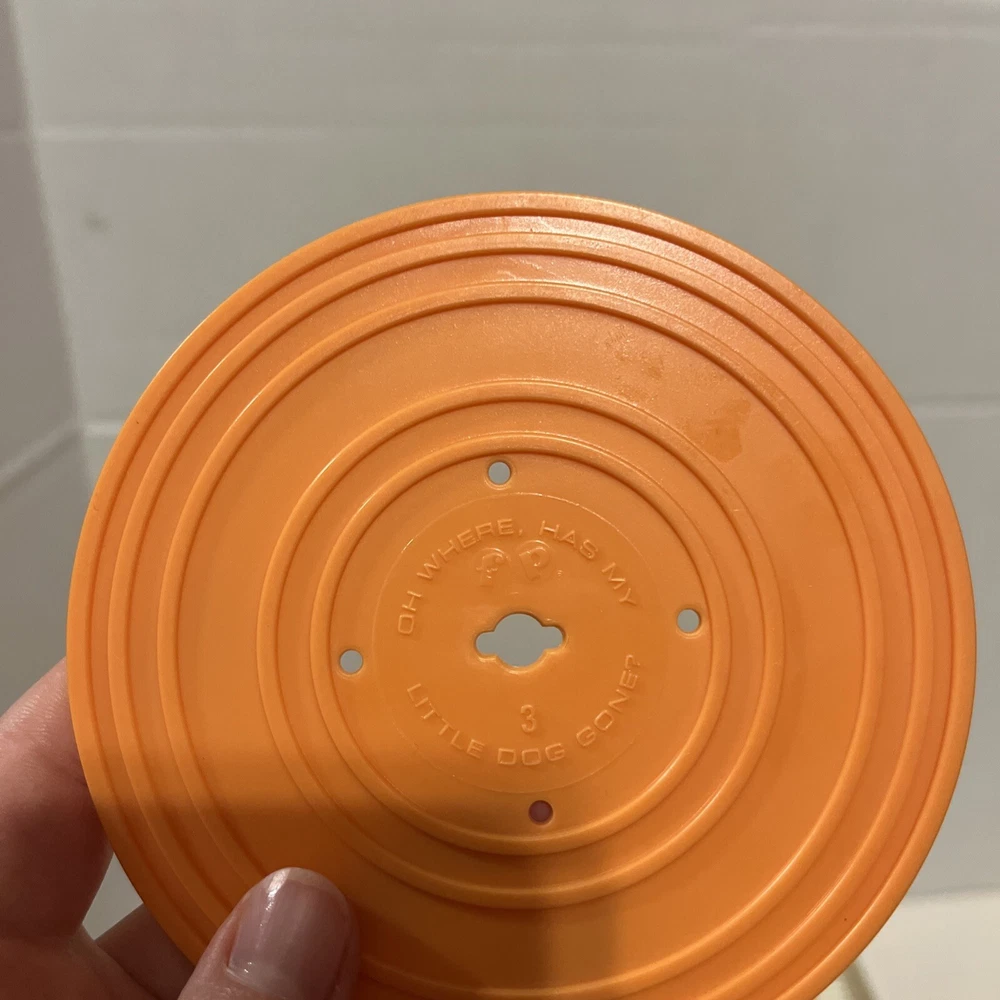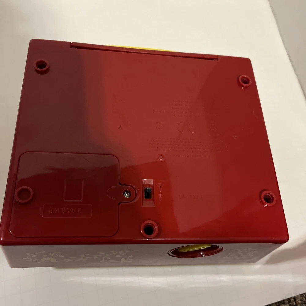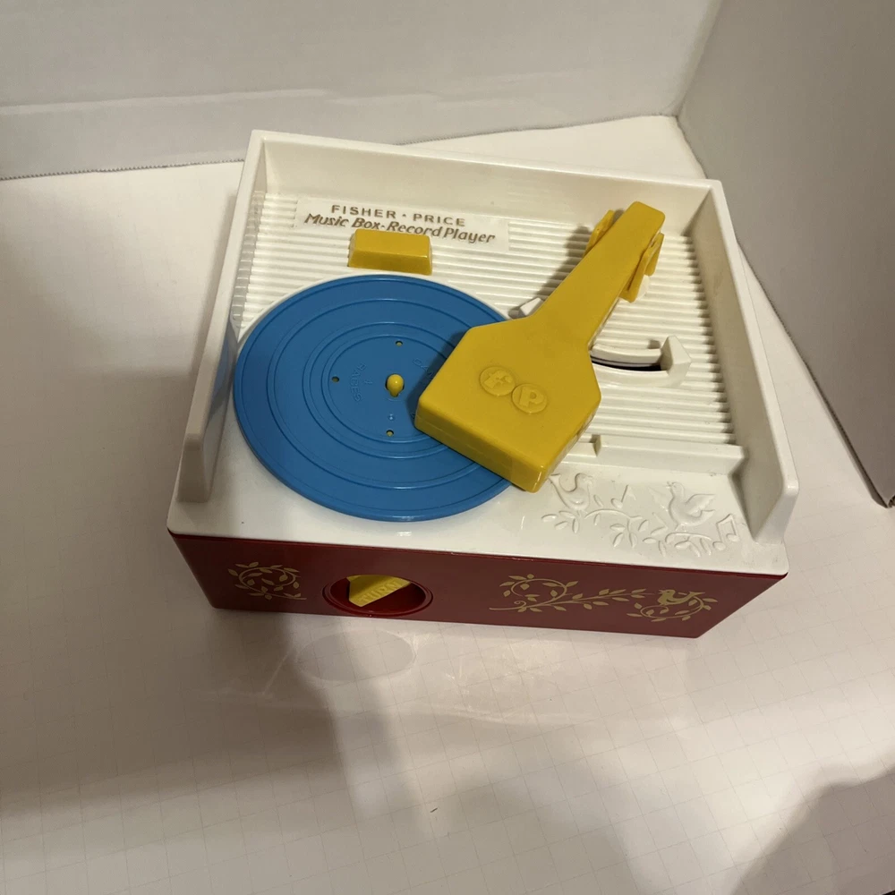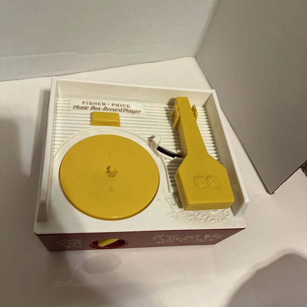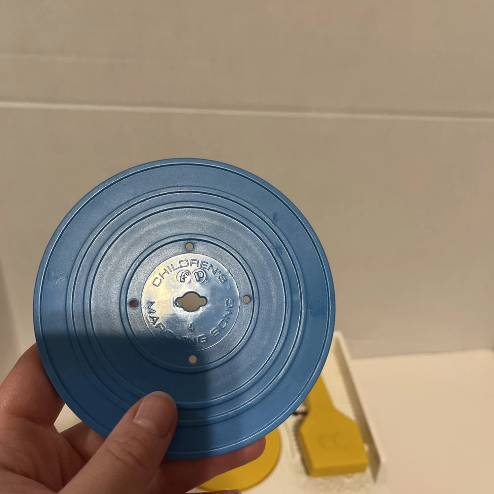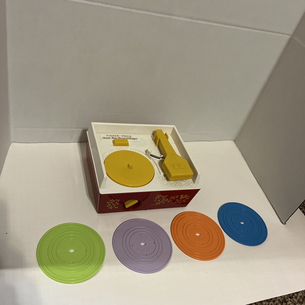 From a smoke free home! Adorable fisher price record player. Works and sounds great! Absolutely no corrosion in the battery pack! Included are 4 records. 1-4. On disc one there is humpty dumpty and jack and Jill. On disc 2, Au Clair De La Lune, and twinkle twinkle little star. Disc 3: oh where, has my little dog gone? And London bridge. On disc 4: camptown races and children’s marching song. When you turn the dial, and it plays the song, it does not sing the song, it just plays the music to these songs. Please ask me any questions.