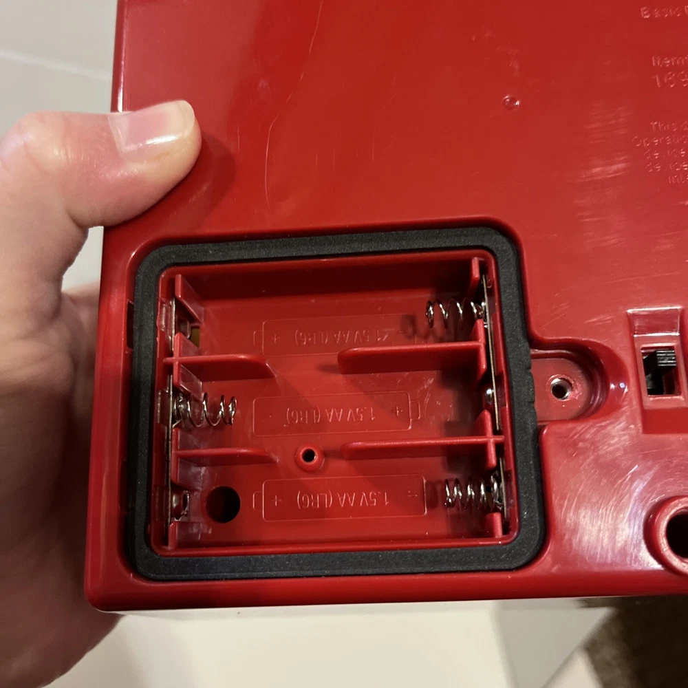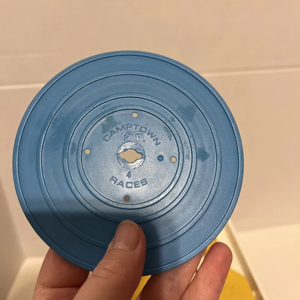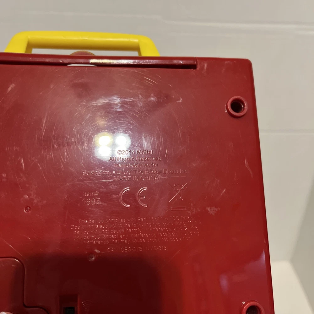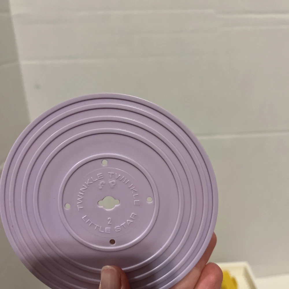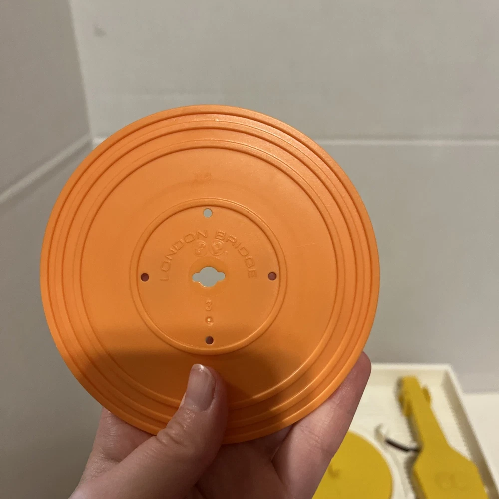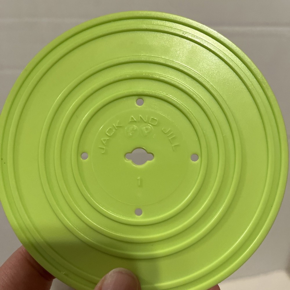 From a smoke free home! Adorable fisher price record player. Works and sounds great! Absolutely no corrosion in the battery pack! Included are 4 records. 1-4. On disc one there is humpty dumpty and jack and Jill. On disc 2, Au Clair De La Lune, and twinkle twinkle little star. Disc 3: oh where, has my little dog gone? And London bridge. On disc 4: camptown races and children’s marching song. When you turn the dial, and it plays the song, it does not sing the song, it just plays the music to these songs. Please ask me any questions.