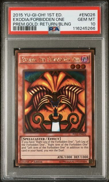 The product is a 2014 Yu-Gi-Oh! Obelisk the Tormentor card from the Premium Gold: Return of the Bling set. It is a Gold Rare English 1st Edition card graded as PSA 10 GEM MINT. This collectible card game item, part of the Yu-Gi-Oh! TCG, is highly sought after by collectors and players alike for its rarity and pristine condition. The Obelisk the Tormentor card is a valuable addition to any Yu-Gi-Oh! card collection, especially for fans of the iconic Exodia the Forbidden One character.