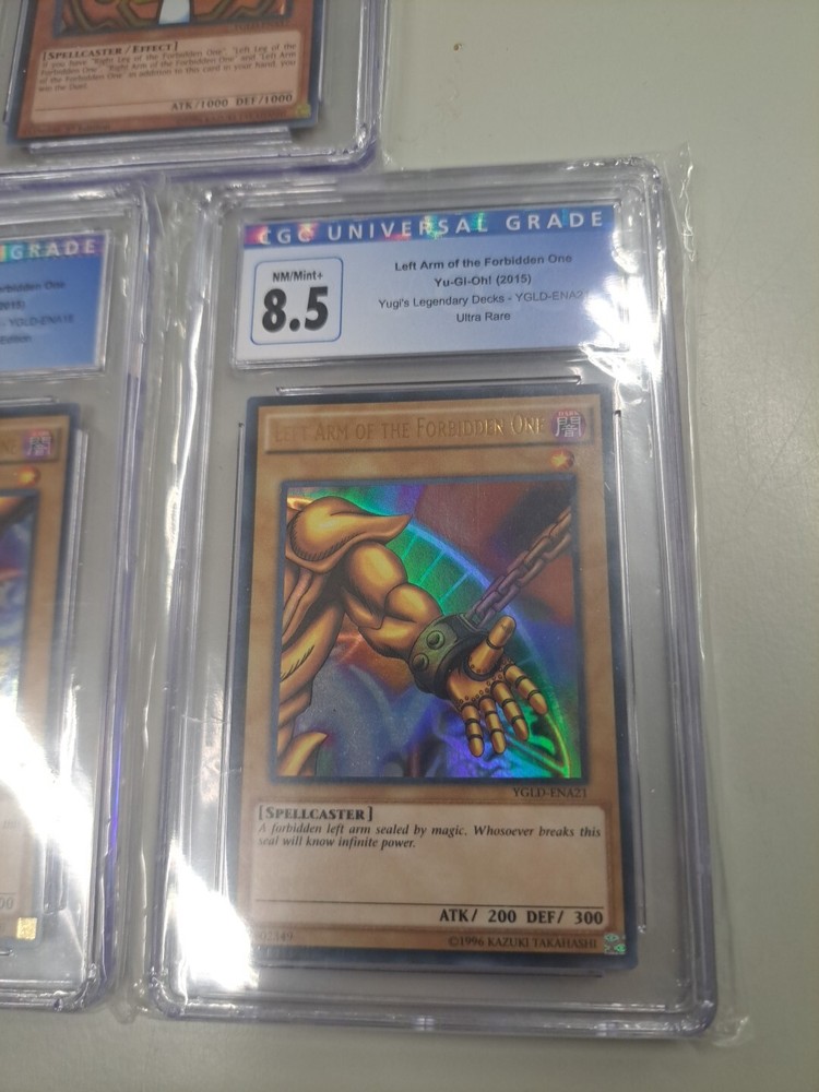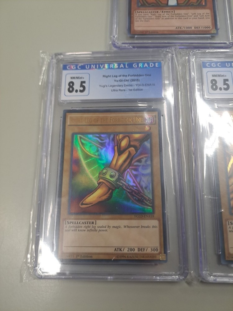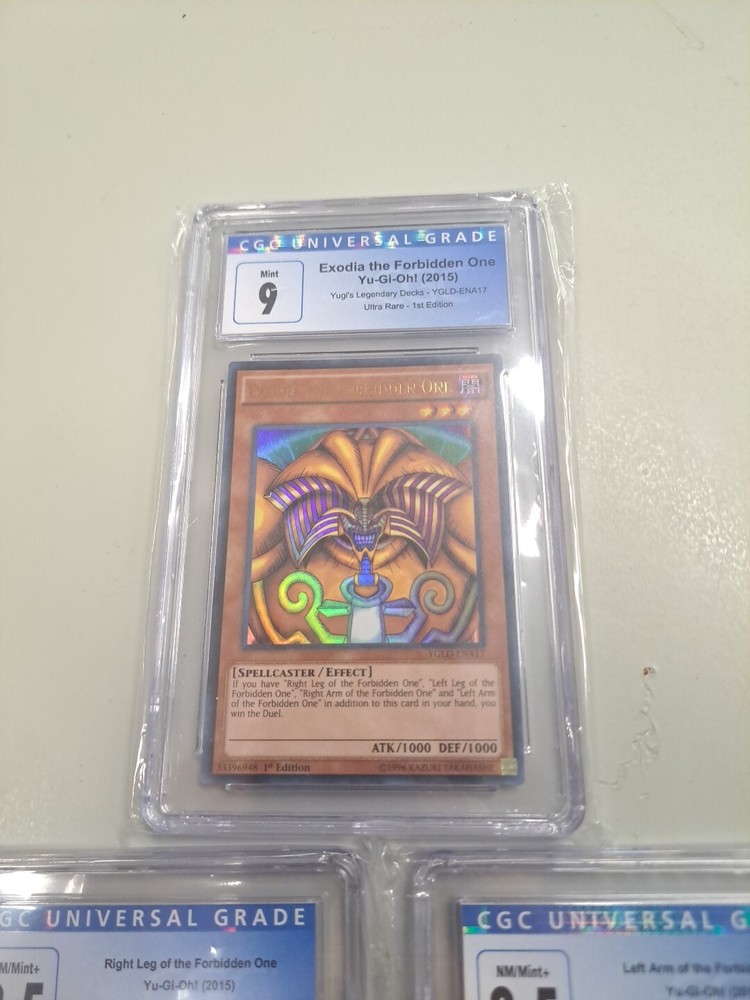 Yugi's Legendary Decks Includes Exodia the Forbidden One Left Arm of the Forbidden One YGLD-ENA21 Grade 8.5 Right Leg of the Forbidden One YGLD-ENA18 Grade 8.5 Selling as is, please check photos. What you see is what you get, if you have any questions please let us know. Thank you!