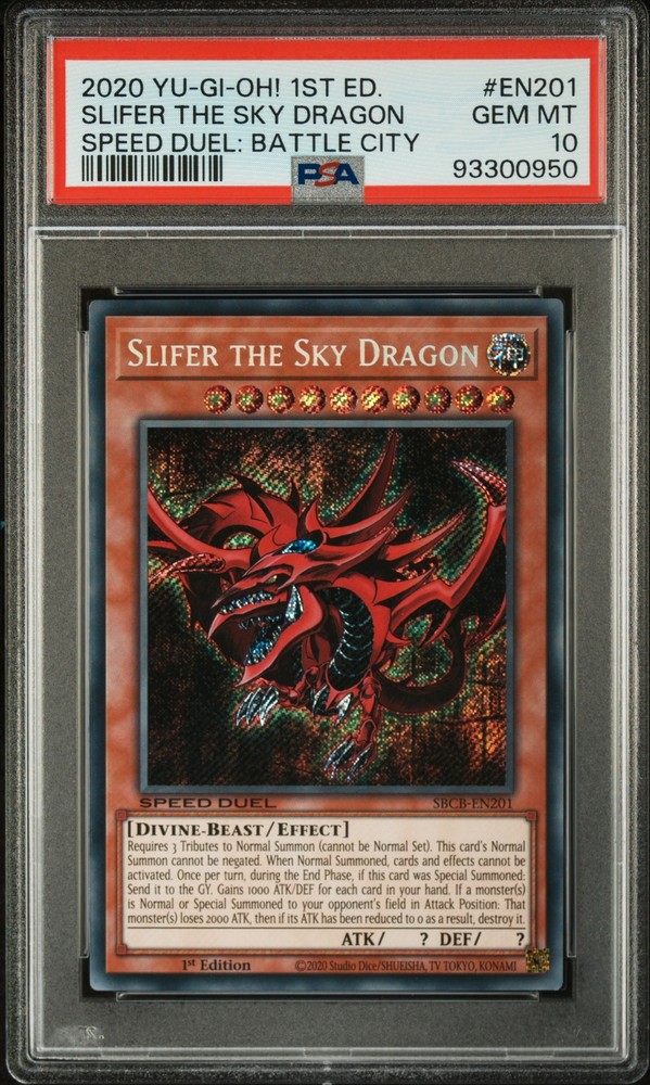 2020 YU-GI-OH! SPEED DUEL: BATTLE CITY BOX 1ST EDITION #EN201 SLIFER THE SKY DRAGON PSA 10 2020 YU-GI-OH! SPEED DUEL: BATTLE CITY BOX 1ST EDITION #EN201 SLIFER THE SKY DRAGON PSA 10 Purchase Info Thank you for your interest in this item consigned with PSA! By purchasing or making an offer on this item, you acknowledge and agree to the following terms: All sales are final. Returns not accepted. Payment must be made upon purchase of the item. All items are sold "as is" and without warranty of Collectors Universe, Inc. (d/b/a PSA), and ANY AND ALL IMPLIED WARRANTIES ARE DISCLAIMED AND EXCLUDED. Sales tax may apply depending on shipping address. PSA does not guarantee that another third-party grading company's authentication or certification of an item as genuine is correct or accurate. Neither a difference of opinion between third-party grading companies about authenticity, nor a company's subsequent reversal of its earlier authentication or certification of an item, will be a basis for rescinding a sale. Any dispute with another third-party grading company relating to the authenticity of an item must be resolved directly with that other company. Collectors' maximum liability in the event of loss or damage to an item during shipping will be the lesser of (a) the price paid for the item and (b) the change in fair market value of the item. You release Collectors from all other liability including for any claims of punitive damages, emotional distress, consequential damages, lost profits, or lost interest, except as prohibited by law. Shipping Purchased Items will be shipped directly from PSA Vault. You stay hands-free. PSA Vault When you purchase this item, you can save on sales tax and selling fees by keeping it in the PSA Vault, official Vault of eBay. Items already in PSA Vault and will be sent to PSA Vault will have no shipping charge Storage of any items with the PSA Vault will be subject to the PSA Vault Terms of Service. Consignment PSA has competitive rates on the world's largest collectibles marketplace with the option to list from the PSA Vault or immediately after PSA authentication and grading. Sale Price Under $100 $100 - $499 $500 - $999 $1,000 - $2,499 $2,500 - $4,999 $5,000+ Seller Fee 16% 14% 13% 10% 9% 7% Sellers pay a single fee as reflected above; no additional eBay fees are incurred. There is a $5 minimum fee on sold items.