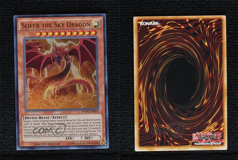 2020 Yu-Gi-Oh! The Dark Side of Dimensions - Movie Pack [Base] - Secret Edition Variant Cards #MVP1-ENSV6 Slifer the Sky Dragon COMC Item: 164951123 - YuGiOh Card - Featuring Slifer the Sky Dragon Search for more: 2020 Yu-Gi-Oh! The Dark Side of Dimensions Search for more: 2020 Yu-Gi-Oh! The Dark Side of Dimensions - Movie Pack [Base] - Secret Edition Variant Cards View all of our Listings Auctions Buy It Now About Us Located in the beautiful Pacific Northwest, COMC (Check Out My Cards) is the world's largest consignment service for trading card singles. More than 10,000 people have used our consignment service to list over 50 million trading cards. Find out how we can help you consign your items on eBay by contacting us through eBay messaging. COMC -- "The Safe & Easy Way to Buy & Sell" Raw Condition for Modern Cards Unless otherwise noted, raw modern cards are listed in Near Mint-Mint condition or better. A NM-MT card appears to be Mint at first glance, but upon closer inspection, may exhibit some of the following: minor print defects (e.g. roller marks, print line, dimple), minor scratches, slight edge wear, and slight corner wear. Centering is clearly visible in the images provided and does not factor into our condition assessment. Raw Condition for Vintage Cards Unless otherwise noted, raw vintage cards are listed in Excellent condition or better. An EX card may exhibit some of the following: minor rounding of corners, surface wear, print defects, light scratches, and slight edge wear/chipping. Centering is clearly visible in the images provided and does not factor into our condition assessment. Domestic Shipping Combined shipping for multiple items is available. To receive combined shipping, please ensure all desired items are in your eBay shopping cart before proceeding to checkout. eBay limits orders to 40 items per order. We automatically combine multiple orders placed on the same day. If you place multiple orders on the same day, please contact us to request a refund of applicable shipping costs. Signature confirmation may be required on invoices over $400. All cards are protected and shipped securely. International Shipping COMC offers eBay's International Shipping (EIS) for international orders under $2,500* (see country exceptions below). All duties and import fees are paid at checkout; in the rare event that there are additional import fees upon delivery, these are borne by the buyer. EIS packages route through a shipping hub in Erlanger, KY before shipping to their final destination. Please note that EIS does not allow for combined shipments. The shipping rates are determined by eBay and cannot be adjusted. *Maximum sale price exceptions: Colombia, Kuwait ($2,000); Taiwan ($1,539); Chile, Costa Rica, Guatemala, Honduras, Trinidad and Tobago ($1,000); Antigua and Barbuda, Aruba, Belize, Dominica, Grenada, Philippines, Saint Kitts and Nevis, Saint Lucia, Montserrat, Turks and Caicos Islands ($500); Dominican Republic, El Salvador ($200). Please request a shipping quote through eBay messaging for orders that exceed the maximum sale price supported by eBay's International Shipping. You will be responsible for all duties and import fees for international orders shipped outside the EIS. All cards are protected and shipped securely. Payment COMC does not accept offers on our cards through our eBay storefront. COMC utilizes eBay’s managed payments system. If you are experiencing difficulties making a payment, please contact eBay for assistance. Return Policy Returns are only accepted on the rare occasion the item is not as described. If you are making a return, please initiate the return process through eBay so a mailing label can be provided for you. Prior to listing, our expert team carefully assessed this item to represent it accurately. Please review the description and high-definition images prior to purchasing to ensure this item meets your satisfaction. We welcome you to contact us if you have further questions about this item. Trust and Integrity COMC carefully assesses each item consigned to us to prevent fraudulent items from entering the marketplace. If you believe an item offered on COMC may be fraudulent, please contact us with details so we can investigate the issue. Items we determine are outside our supported items policy may be removed. Last Modified: 5/20/2025 9:14:40 AM PDT