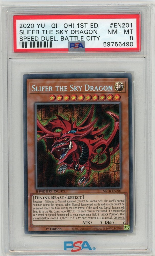 2020 YuGiOh Speed Duel: Battle City - # SBCB-EN201 Slifer the Sky Dragon - PSA 8 (S8) Photos in the listing is the exact card you will be receiving Item is in great condition with no cracks and placed in fitted sleeve Item will be shipped USPS with tracking Please confirm that this is the set and version of card you are looking to purchase. All sales are final. Please let me know if you have any questions or would like to see any other photos. Thank You.