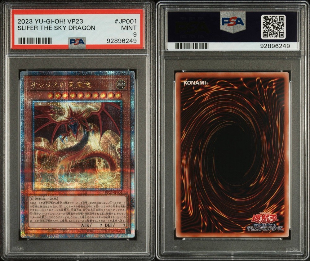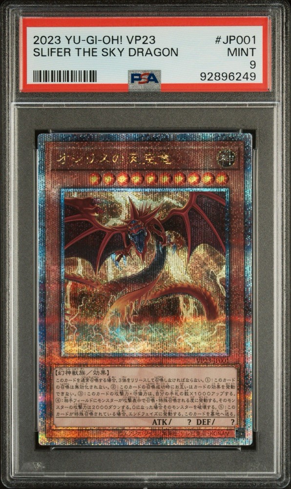 The product is a 2023 Yu-Gi-Oh! VP23 Slifer The Sky Dragon card from the Yugi set, featuring the character Yami Yugi. Still sealed in plastic This Secret Rare card is graded as a PSA 9 and is in Japanese language with a Holo finish. Manufactured by Konami in Japan, this Divine-Beast creature type card is a valuable collectible for fans of the Yu-Gi-Oh! TCG. With its rarity and high grade, this card is highly sought after by collectors looking to add it to their collection.