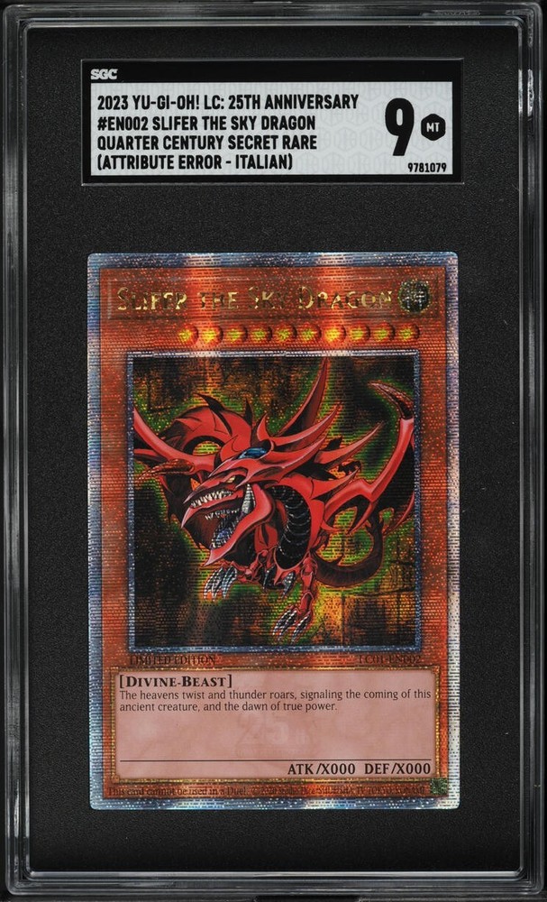 Step into the realm of the ancients with the 2023 Yugioh LC01 25th Anniversary Slifer The Sky Dragon #LC01-EN002, a card that echoes with the rich history of the Yu-Gi-Oh! TCG. This iconic piece is a must-have for collectors and duelists alike, encapsulating the timeless appeal of one of the series' most revered deities. Graded SGC 9, this card is a testament to Slifer's enduring legacy and a striking addition to any collection. Its pristine condition ensures it's ready for display or battle, making it a superb find for enthusiasts who value nostalgia and quality in their Yu-Gi-Oh! TCG memorabilia.