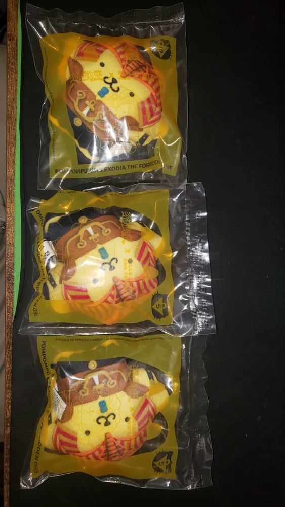 Brand new, I have 3 available Introducing the limited edition 2024 McDonald's Yu-Gi-Oh! x Hello Kitty #5 Pompompurin x Exodia the Forbidden One collectibles. This set includes three plush toys featuring the iconic characters from the popular TV show, Yu-Gi-Oh!. The toys are made of high-quality materials and were manufactured in China in 2024.The set includes Pompompurin, Exodia, and another character, all of which are fan favorites. These collectibles are perfect for any Yu-Gi-Oh! fan or collector looking to add to their collection. The set is a must-have for anyone who loves the franchise and is a great addition to any collection.