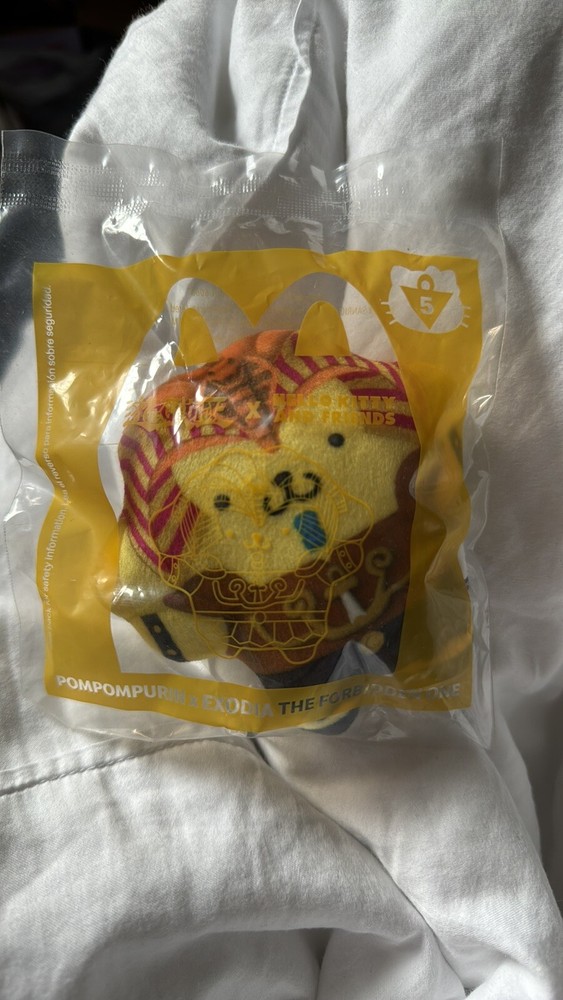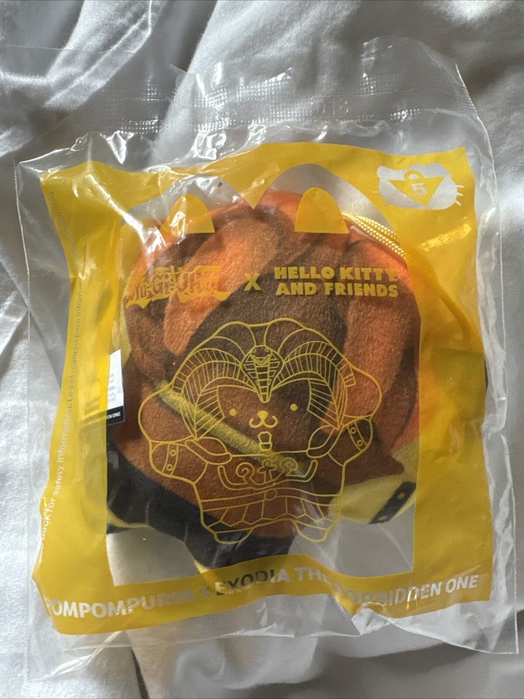 Introducing the 2024 McDonald's Yu-Gi-Oh x Hello Kitty #5 Pompompurin x Exodia the Forbidden One plush toy! This limited edition collectible features the iconic characters Pompompurin and Exodia the Forbidden One, dressed in stylish outfits and ready to battle it out. The plush material is soft and huggable, making it perfect for fans of all ages. This item is a must-have for any Hello Kitty or Yu-Gi-Oh collector. It was manufactured in China and is an officially licensed product. Don't miss your chance to add this unique piece to your collection.