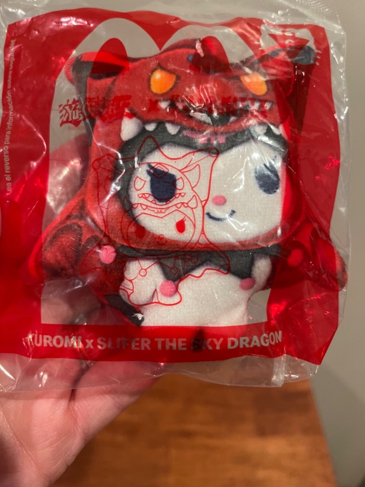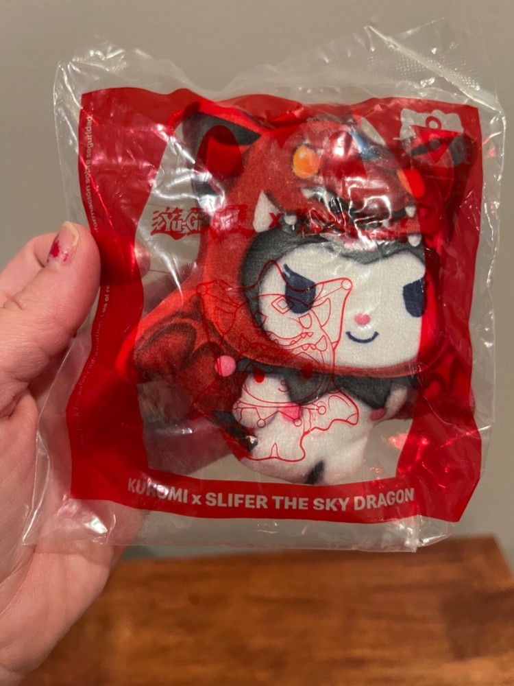 Introducing the 2024 McDonalds Yu-Gi-Oh! x Hello Kitty #6 Kuromi x Slifer The Sky Dragon Toy. This collectible item features the beloved characters from the popular anime series, Yu-Gi-Oh! and Hello Kitty. The plush toy is made of high-quality materials and comes in a vibrant red color. It's perfect for fans of the Yu-Gi-Oh! franchise who love to collect unique items. The toy has been manufactured in China and is in compliance with all safety standards. The item is a great addition to any collection and is sure to be a conversation starter. Get your hands on this rare piece of anime merchandise today!