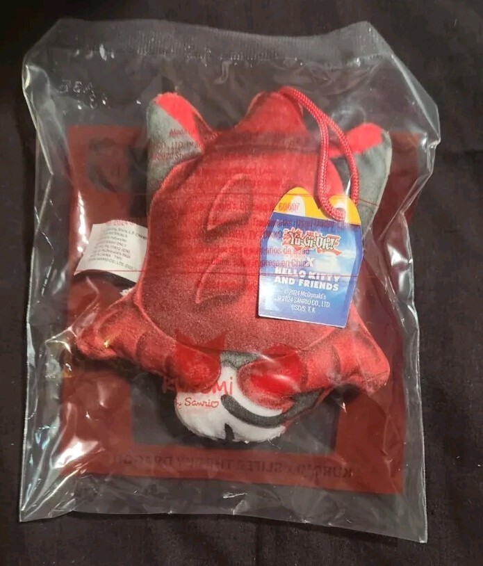 Introducing the 2024 McDonalds Yu-Gi-Oh! x Hello Kitty #6 Kuromi x Slifer The Sky Dragon Toy. This adorable plush toy features the beloved characters from the Yu-Gi-Oh! and Hello Kitty franchises, and is sure to delight collectors and fans alike. The red color and animated theme make it a perfect addition to any collection, and it is a must-have for fans of Slifer The Sky Dragon. This item is made in China and features English language text. It is not signed and is categorized as a collectible in the Animation Merchandise section. Perfect for fans of the Yu-Gi-Oh! TV show, this toy is a great find for anyone who loves animation.