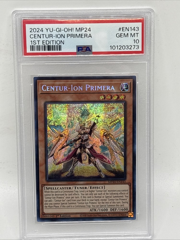 The product is a 1st Edition English Yugioh card from the "Legendary Duelists" set, featuring the character Dark Magician and the creature type Harpy. It is a Secret Rare card named "Slifer The Sky Dragon" with card number 2024. The card has a Holo finish and is part of the 25th-anniversary Centurion Primera series, graded as PSA 10.