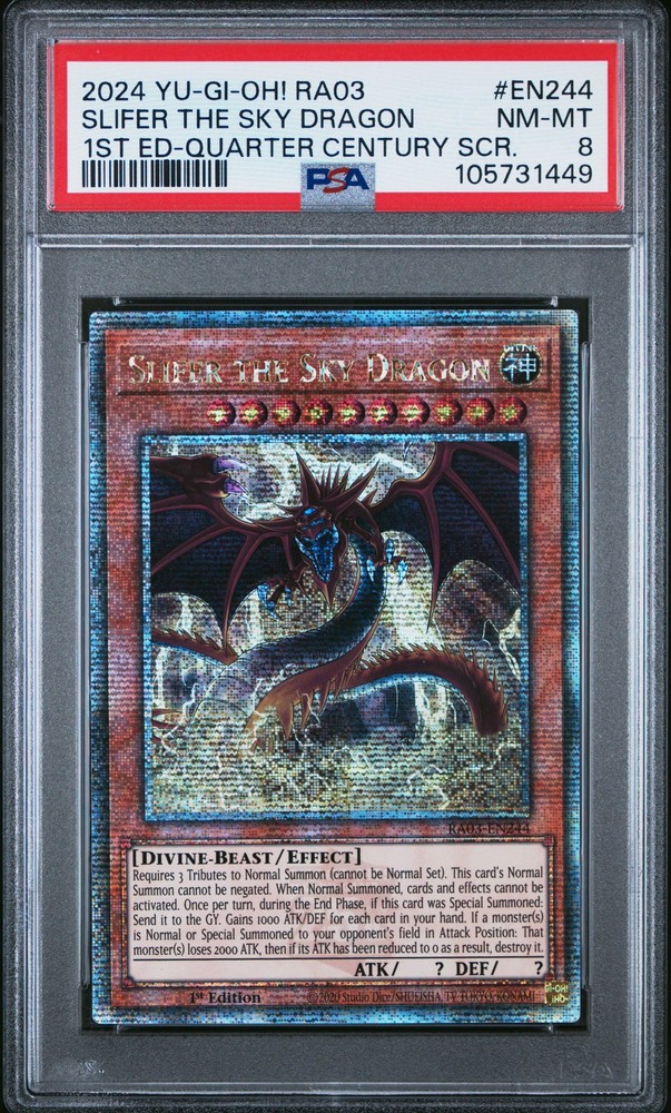 2024 YU-GI-OH! RA03-QUARTER CENTURY BONANZA 1ST EDITION-QUARTER CENTURY SECRET RARE #EN244 SLIFER THE SKY DRAGON PSA 8 2024 YU-GI-OH! RA03-QUARTER CENTURY BONANZA 1ST EDITION-QUARTER CENTURY SECRET RARE #EN244 SLIFER THE SKY DRAGON PSA 8 Purchase Info Thank you for your interest in this item consigned with PSA! By purchasing or making an offer on this item, you acknowledge and agree to the following terms: All sales are final. Returns not accepted. Payment must be made upon purchase of the item. All items are sold "as is" and without warranty of Collectors Universe, Inc. (d/b/a PSA), and ANY AND ALL IMPLIED WARRANTIES ARE DISCLAIMED AND EXCLUDED. Sales tax may apply depending on shipping address. PSA does not guarantee that another third-party grading company's authentication or certification of an item as genuine is correct or accurate. Neither a difference of opinion between third-party grading companies about authenticity, nor a company's subsequent reversal of its earlier authentication or certification of an item, will be a basis for rescinding a sale. Any dispute with another third-party grading company relating to the authenticity of an item must be resolved directly with that other company. Collectors' maximum liability in the event of loss or damage to an item during shipping will be the lesser of (a) the price paid for the item and (b) the change in fair market value of the item. You release Collectors from all other liability including for any claims of punitive damages, emotional distress, consequential damages, lost profits, or lost interest, except as prohibited by law. Shipping Purchased Items will be shipped directly from PSA Vault. You stay hands-free. PSA Vault When you purchase this item, you can save on sales tax and selling fees by keeping it in the PSA Vault, official Vault of eBay. Items already in PSA Vault and will be sent to PSA Vault will have no shipping charge Storage of any items with the PSA Vault will be subject to the PSA Vault Terms of Service. Consignment PSA has competitive rates on the world's largest collectibles marketplace with the option to list from the PSA Vault or immediately after PSA authentication and grading. Sale Price Under $100 $100 - $499 $500 - $999 $1,000 - $2,499 $2,500 - $4,999 $5,000+ Seller Fee 16% 14% 13% 10% 9% 7% Sellers pay a single fee as reflected above; no additional eBay fees are incurred. There is a $5 minimum fee on sold items.