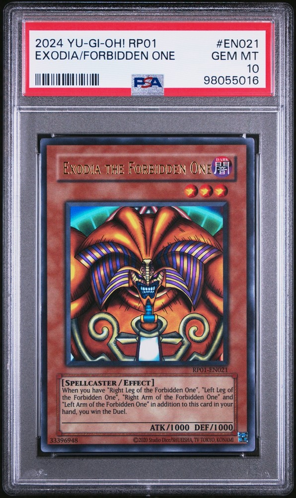 2024 YU-GI-OH! RP01-RETRO PACK #EN021 EXODIA THE FORBIDDEN ONE PSA 10 2024 YU-GI-OH! RP01-RETRO PACK #EN021 EXODIA THE FORBIDDEN ONE PSA 10 Purchase Info Thank you for your interest in this item consigned with PSA! By purchasing or making an offer on this item, you acknowledge and agree to the following terms: All sales are final. Returns not accepted. Payment must be made upon purchase of the item. All items are sold "as is" and without warranty of Collectors Universe, Inc. (d/b/a PSA), and ANY AND ALL IMPLIED WARRANTIES ARE DISCLAIMED AND EXCLUDED. Sales tax may apply depending on shipping address. PSA does not guarantee that another third-party grading company's authentication or certification of an item as genuine is correct or accurate. Neither a difference of opinion between third-party grading companies about authenticity, nor a company's subsequent reversal of its earlier authentication or certification of an item, will be a basis for rescinding a sale. Any dispute with another third-party grading company relating to the authenticity of an item must be resolved directly with that other company. Collectors' maximum liability in the event of loss or damage to an item during shipping will be the lesser of (a) the price paid for the item and (b) the change in fair market value of the item. You release Collectors from all other liability including for any claims of punitive damages, emotional distress, consequential damages, lost profits, or lost interest, except as prohibited by law. Shipping Purchased Items will be shipped directly from PSA Vault. You stay hands-free. PSA Vault When you purchase this item, you can save on sales tax and selling fees by keeping it in the PSA Vault, official Vault of eBay. Items already in PSA Vault and will be sent to PSA Vault will have no shipping charge Storage of any items with the PSA Vault will be subject to the PSA Vault Terms of Service. Consignment PSA has competitive rates on the world's largest collectibles marketplace with the option to list from the PSA Vault or immediately after PSA authentication and grading. Sale Price Under $100 $100 - $499 $500 - $999 $1,000 - $2,499 $2,500 - $4,999 $5,000+ Seller Fee 16% 14% 13% 10% 9% 7% Sellers pay a single fee as reflected above; no additional eBay fees are incurred. There is a $5 minimum fee on sold items.