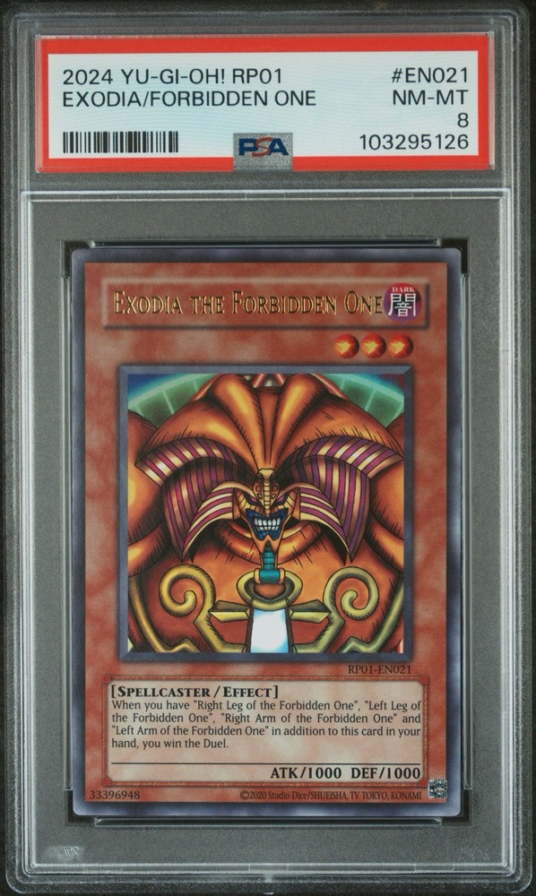 The product is a Yu-Gi-Oh! TCG card from the 2024 RP01-Retro Pack set, featuring the iconic character Exodia the Forbidden One. The specific card is "Exodia the Forbidden One" with card number EN021, graded as a PSA 8. This collectible card is highly sought after by fans and collectors of the Yu-Gi-Oh! trading card game, known for its rarity and significance within the game's lore.