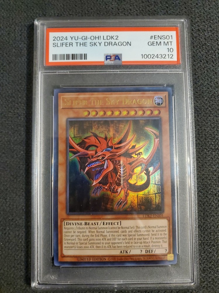 The product is a 2024 Ultra Rare "Slifer The Sky Dragon" card from the "- Yugi -" set of the Yu-Gi-Oh! TCG. It features the Divine-Beast creature type and is made of card stock with a foil finish. Manufactured by Konami in the United States, this Limited Edition card has the Card Number 2024 and is highly sought after by collectors.